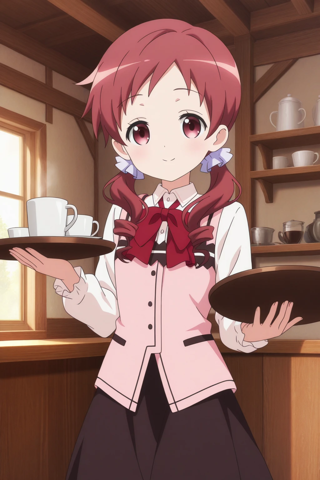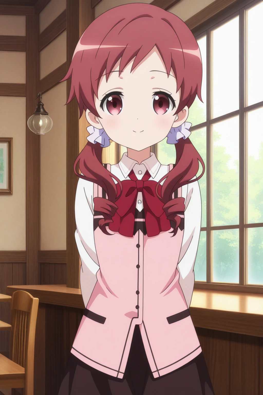aamegumi, red eyes, red hair, low twintails, white hair scrunchie, hair over shoulder, megumiwork, red bowtie, white dress shirt, pink vest, black skirt, long skirt,Casual Clothing: