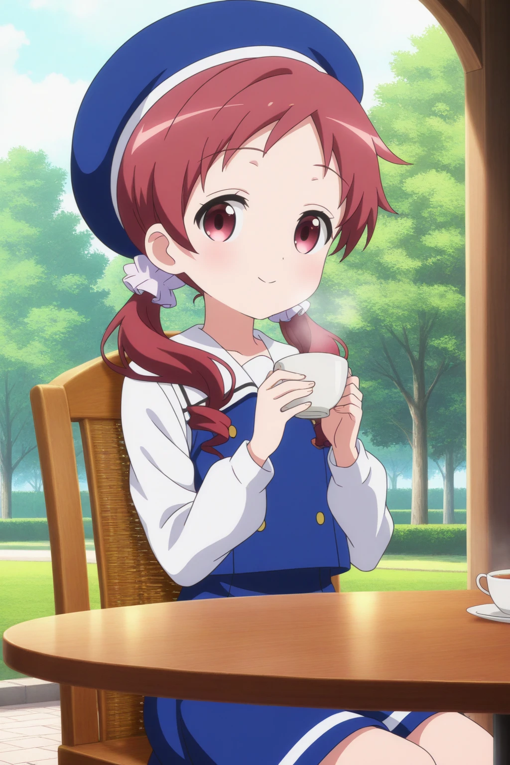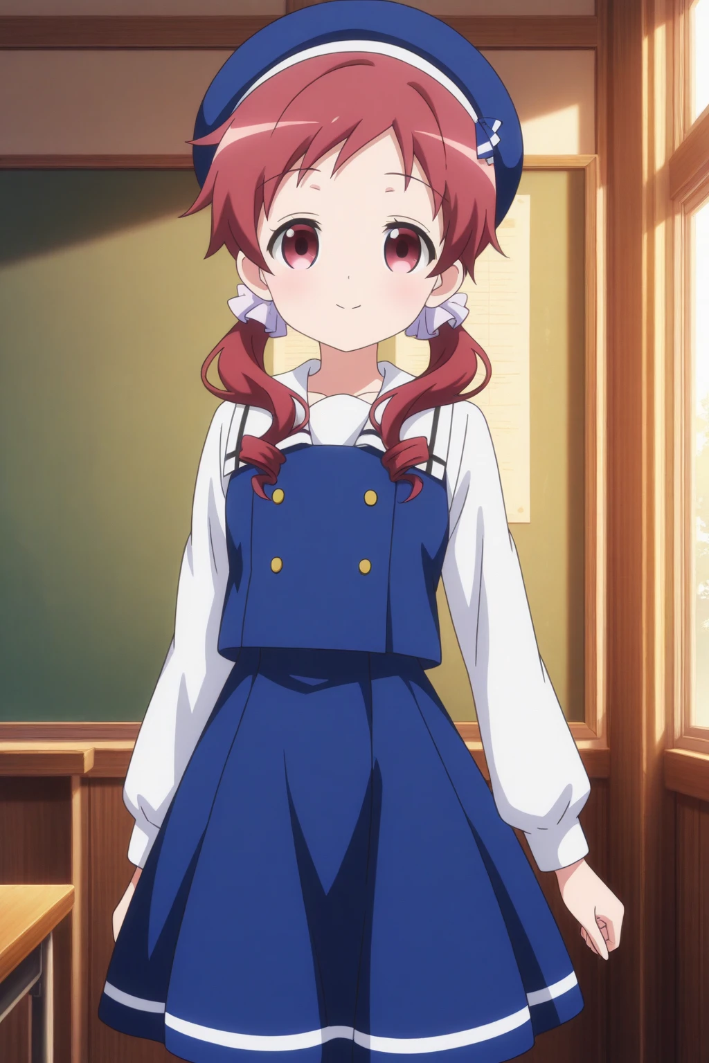 aamegumi, red eyes, red hair, low twintails, white hair scrunchie, hair over shoulder, megumiwinter, blue beret, white sailor collar, white shirt, long sleeves, blue vest, blue skirt, pleated skirt,Work Clothes: