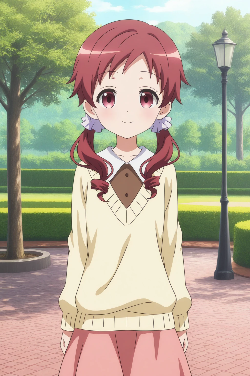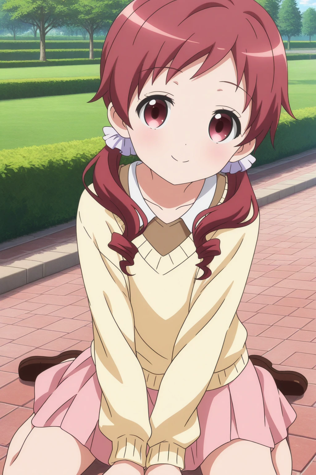 aamegumi, red eyes, red hair, low twintails, white hair scrunchie, hair over shoulder, megumic1, brown shirt, white shirt collar, yellow sweater, pink skirt,
