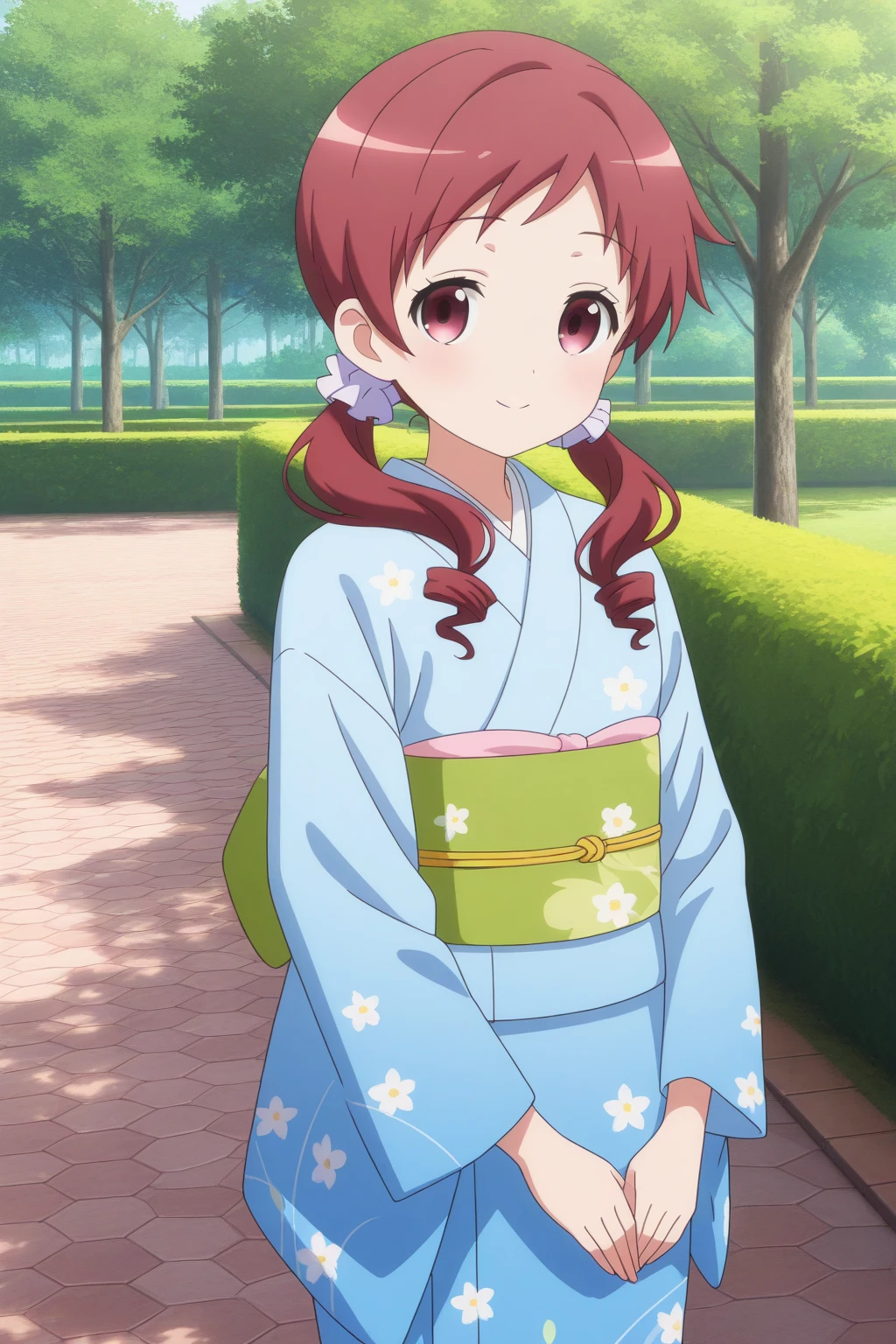 aamegumi, red eyes, red hair, low twintails, white hair scrunchie, hair over shoulder, megumic1, brown shirt, white shirt collar, yellow sweater, pink skirt,Description