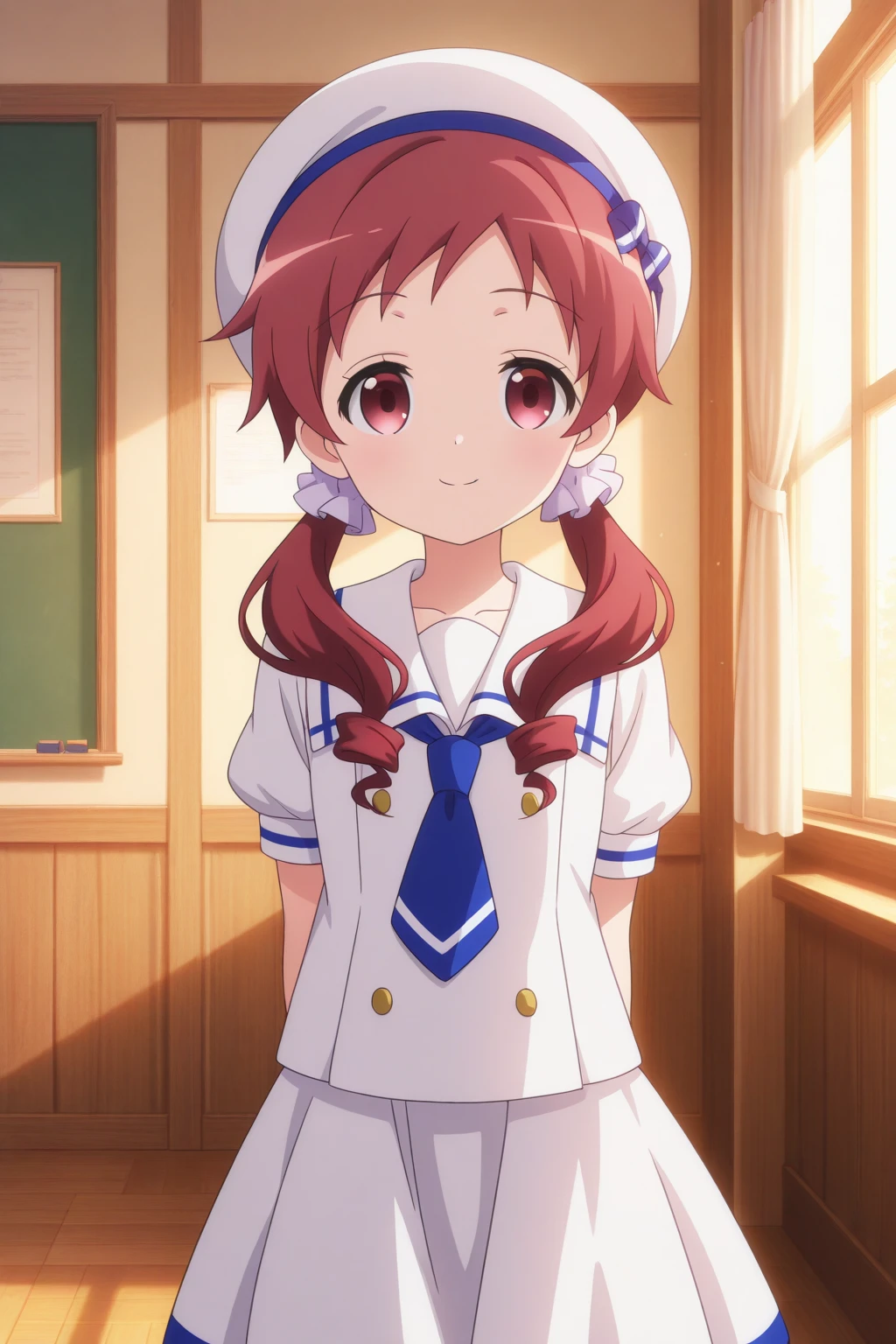 aamegumi, red eyes, red hair, low twintails, white hair scrunchie, hair over shoulder, megumisummer, white beret, white sailor collar, blue neckerchief, white sailor shirt, puffy short sleeves, white skirt, pleated skirt,Winter School Uniform: