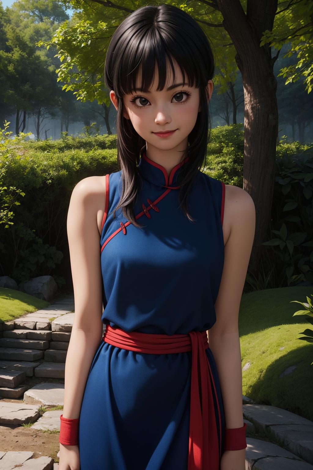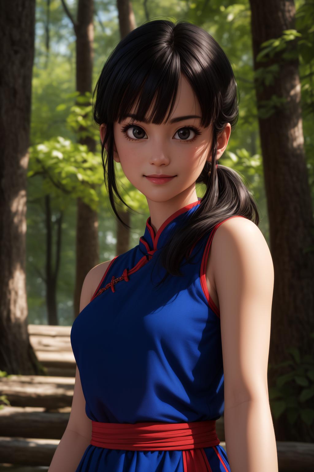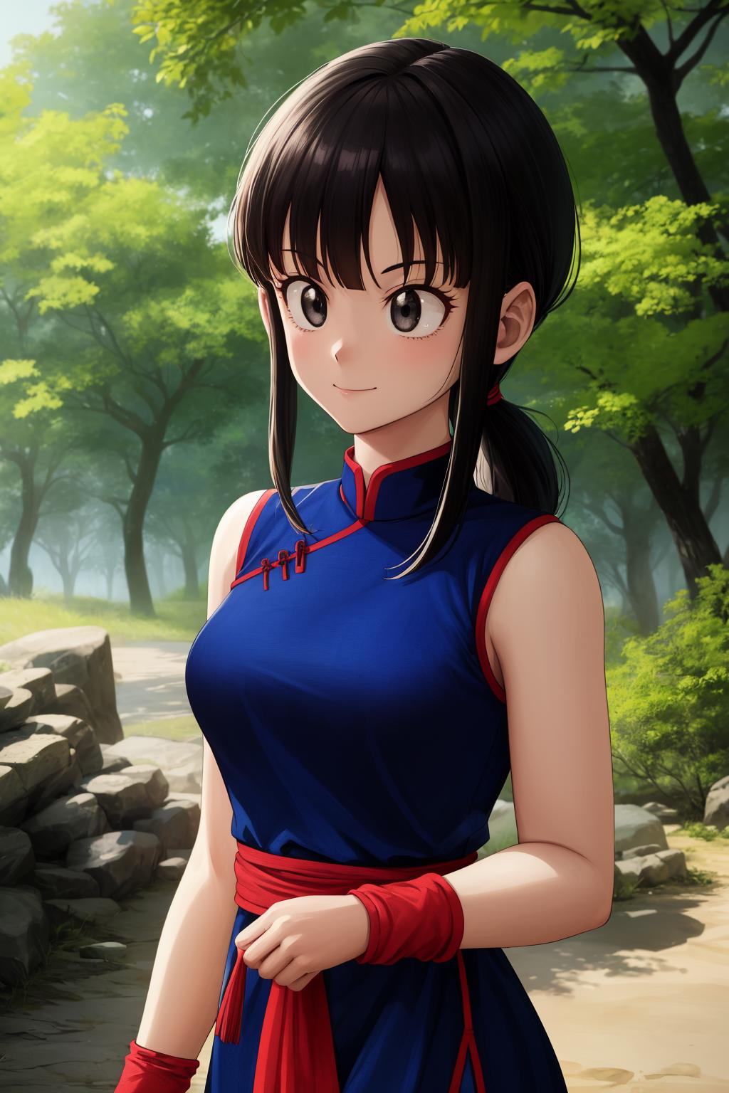 chichi, 1girl, solo, black eyes, black hair, blunt bangs, sidelocks, low ponytail,