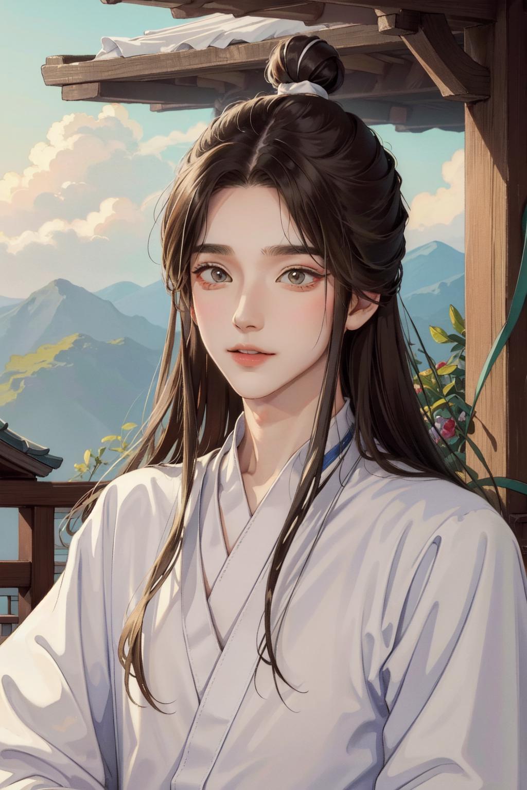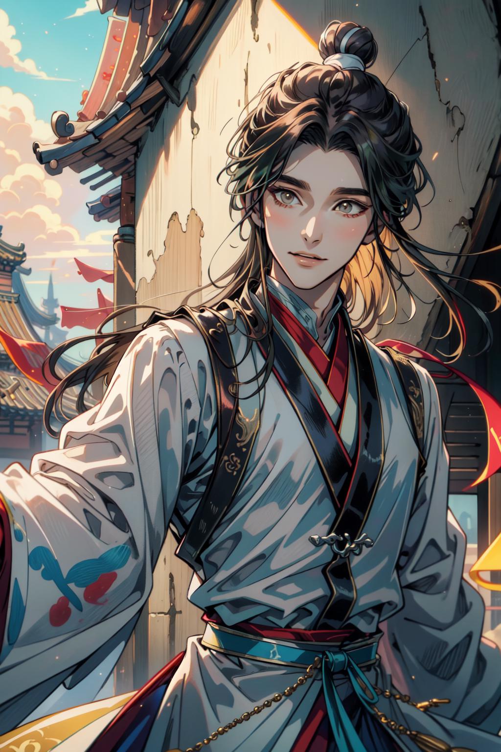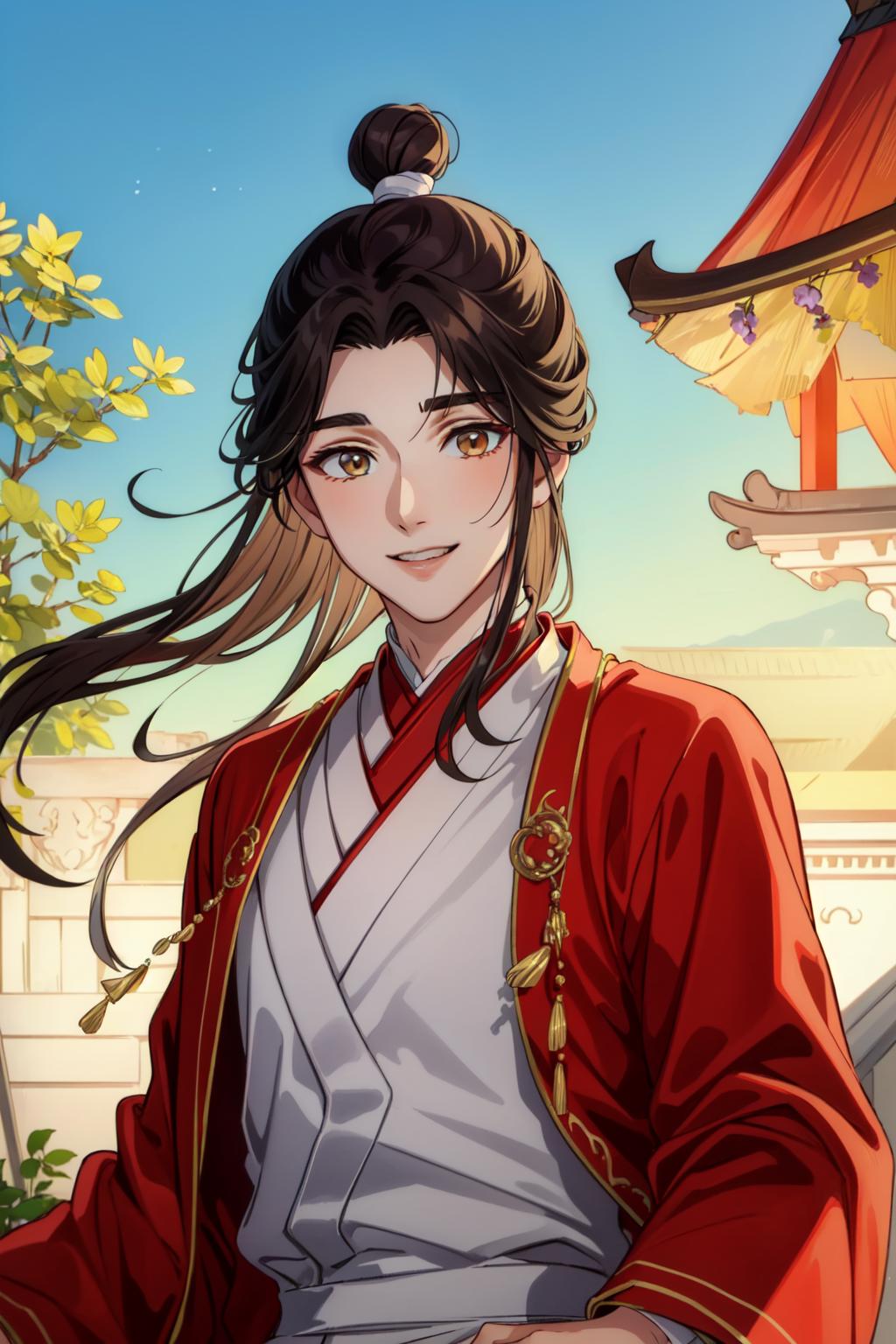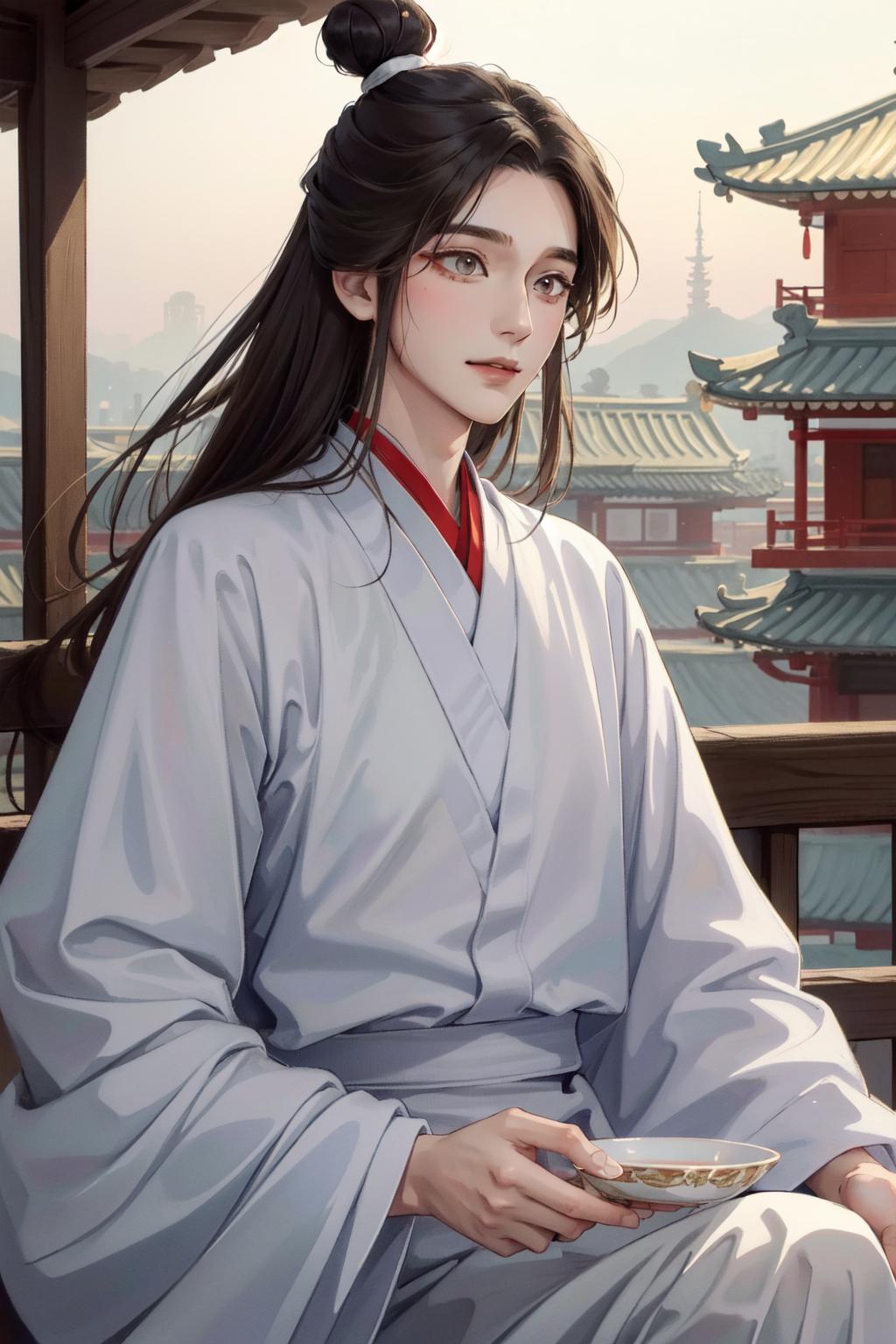 tags: xie lian, 1boy, male focus, chinese clothes, hair bun