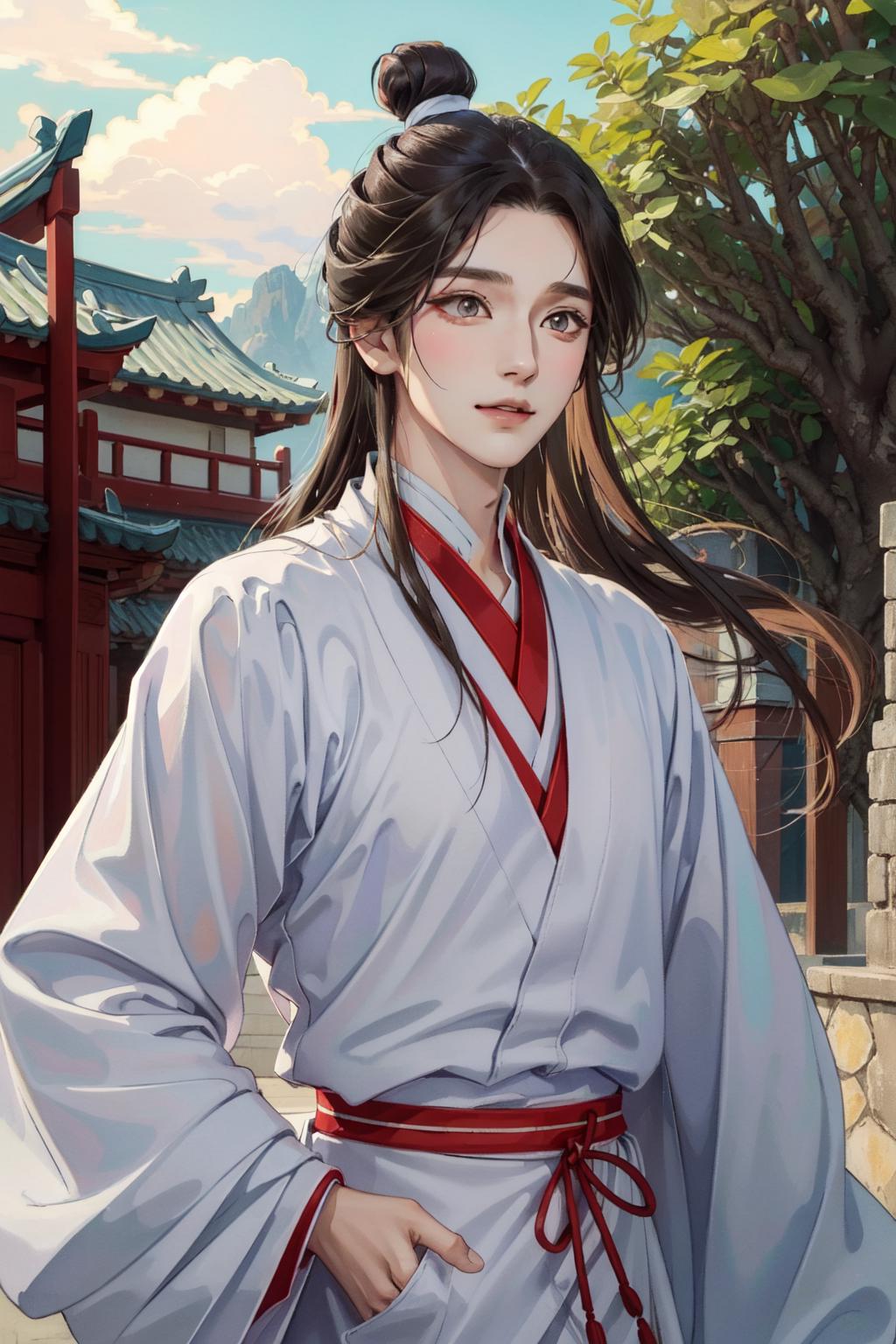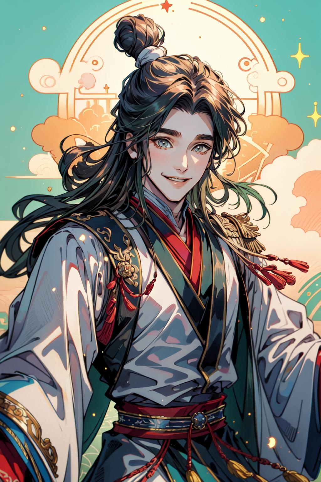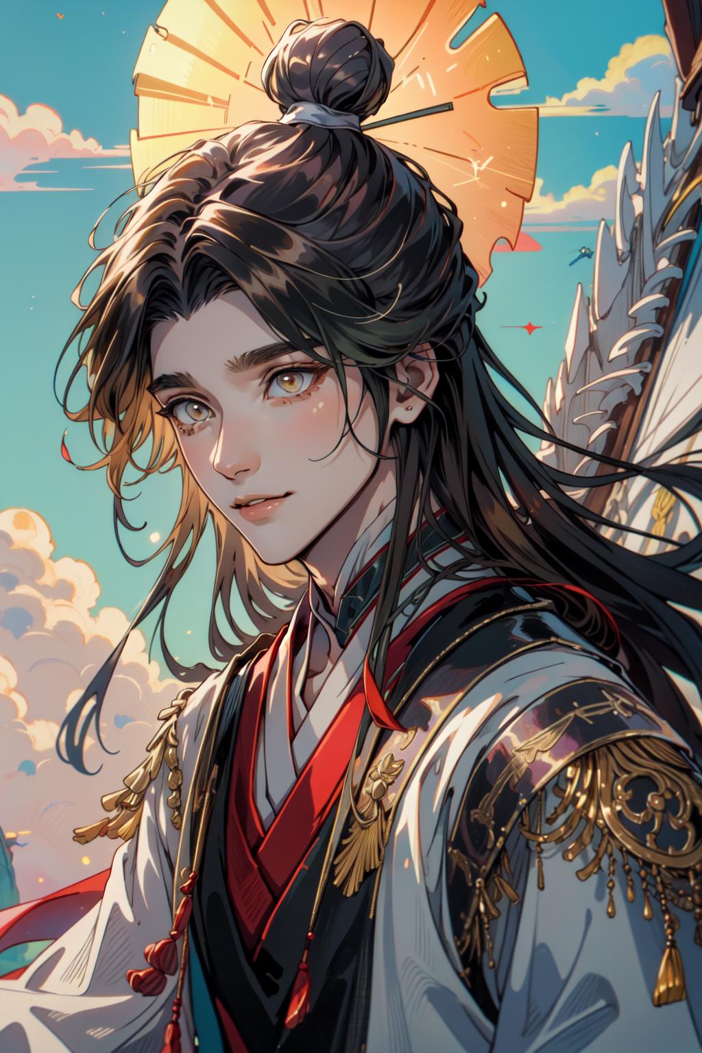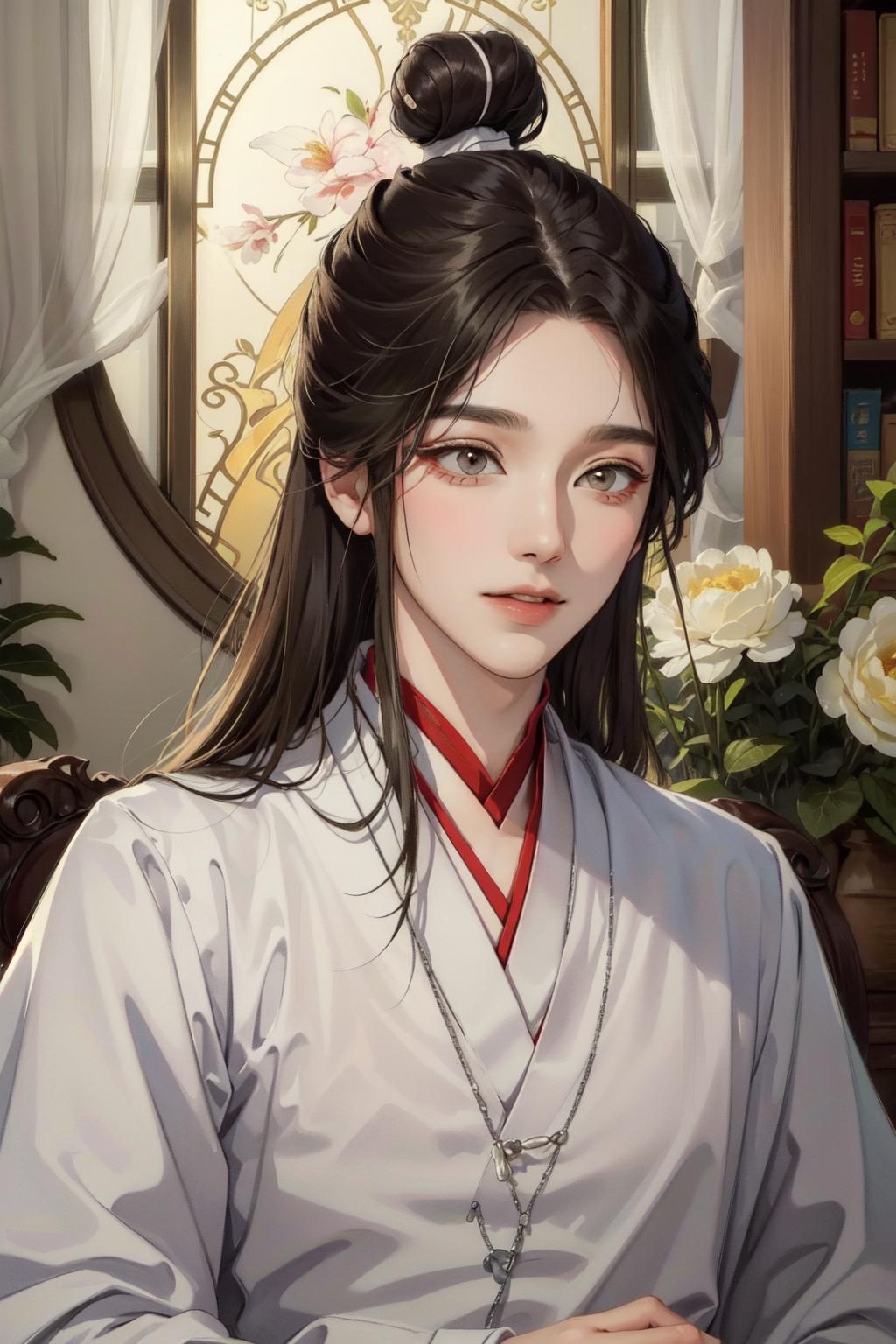 tags: xie lian, 1boy, male focus, chinese clothes, hair bun