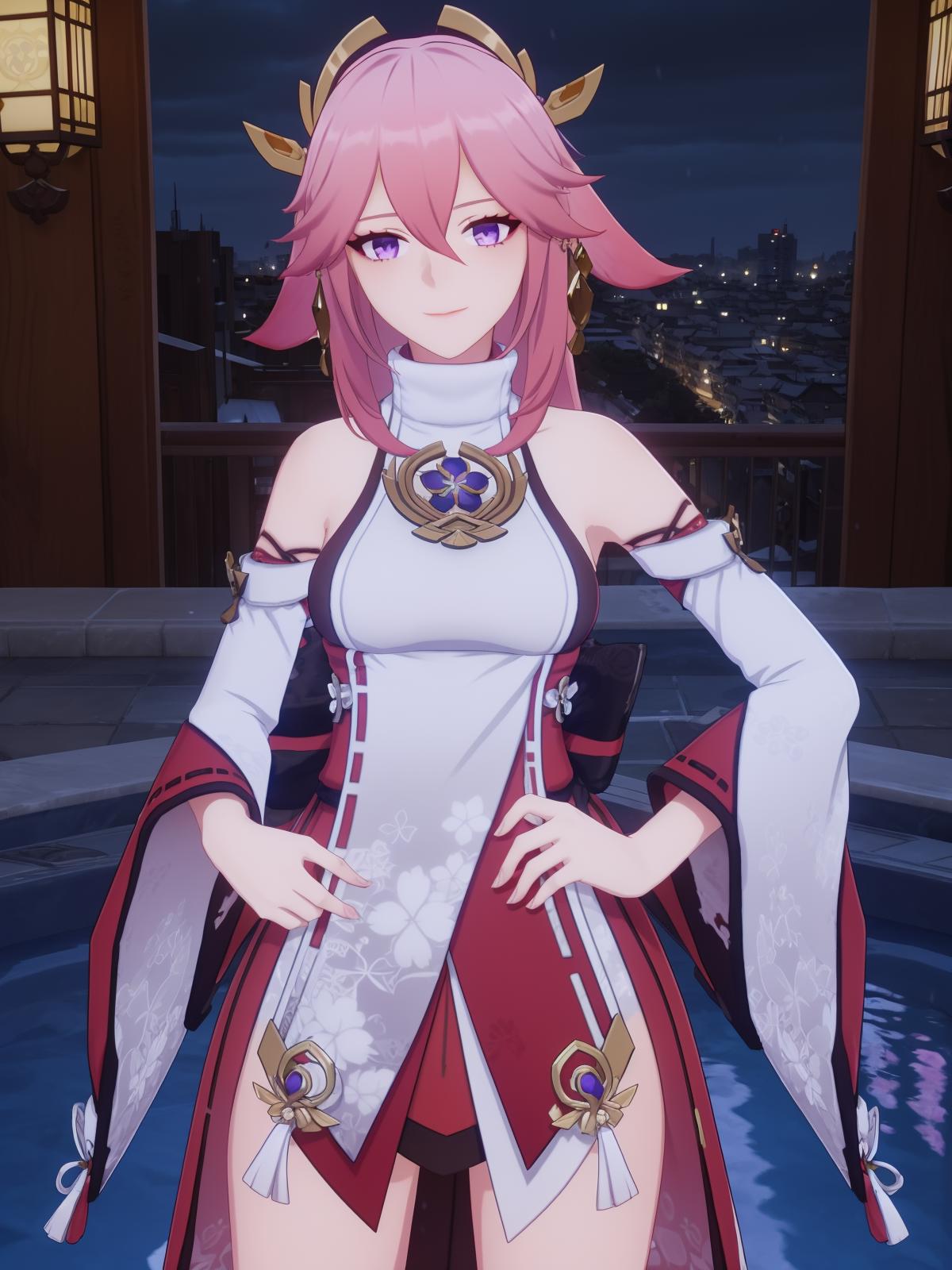 这是一个来自游戏《原神》的角色——八重神子。本Lora训练图集不包含任何真人图片。底模使用相见欢。参考Lora权重0.75。