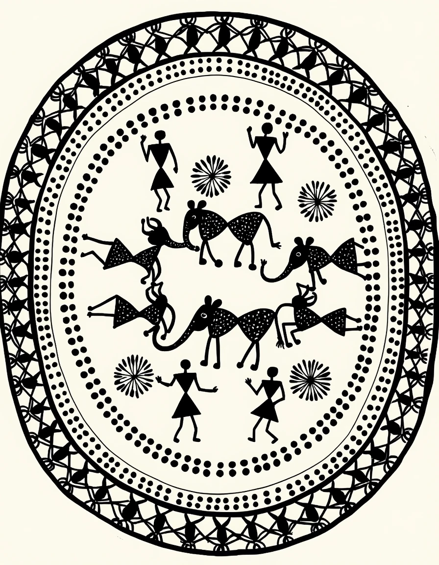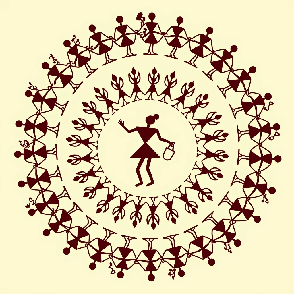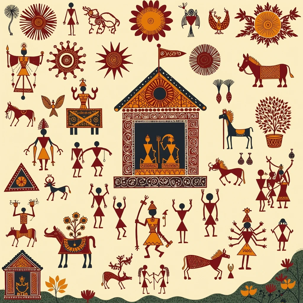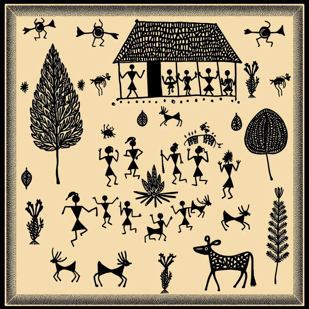 Cultural Context and Layering: Warli art is deeply rooted in cultural storytelling. Include multiple elements and layers in your prompts to create a rich, narrative-driven composition that reflects the traditional Warli storytelling method.