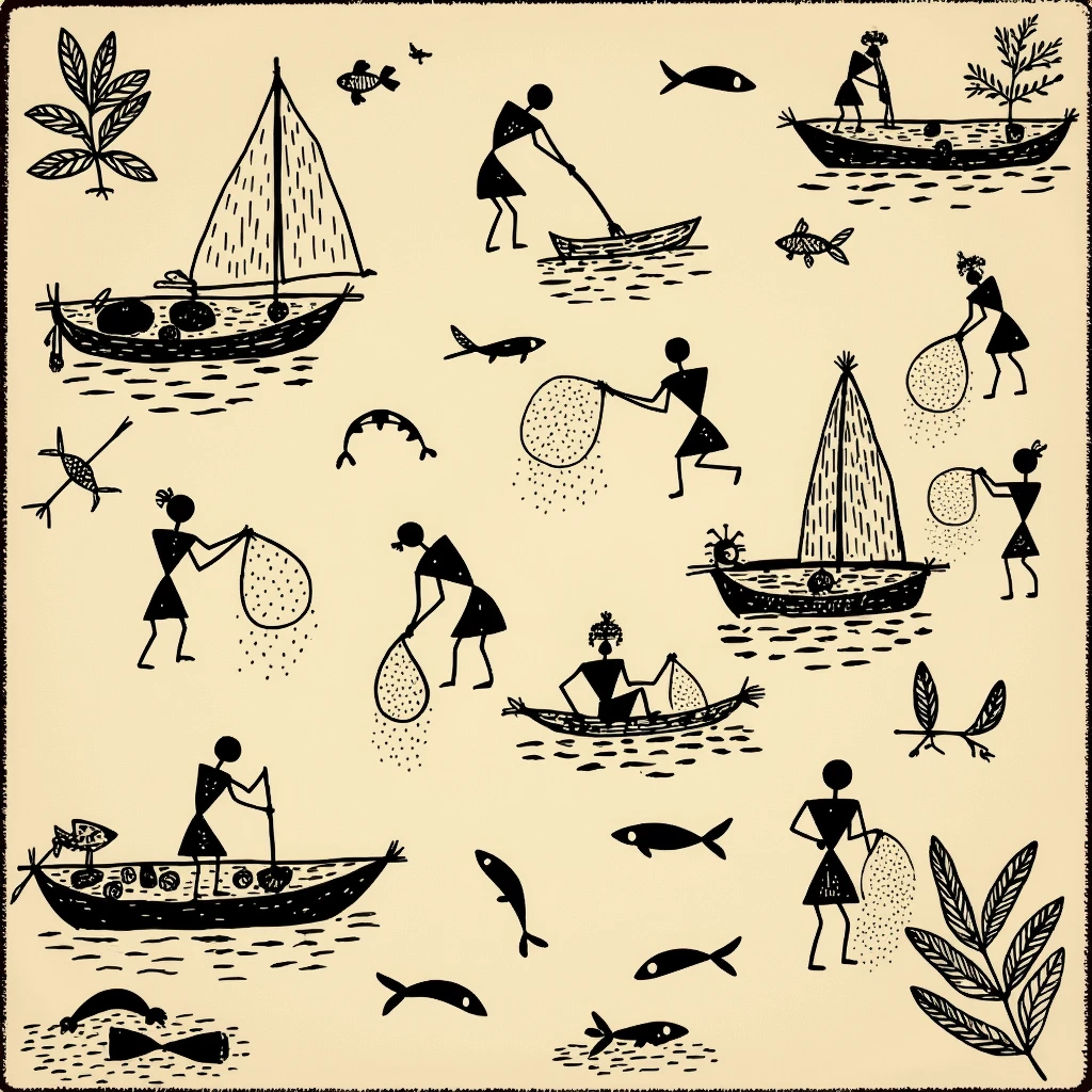 Layering and Context: Warli art often depicts scenes in layers, such as multiple groups of people or animals interacting in different parts of the scene. Including this in your prompt can add depth and complexity to your artwork (e.g., “fishermen casting nets with fish swimming below, birds flying above”).