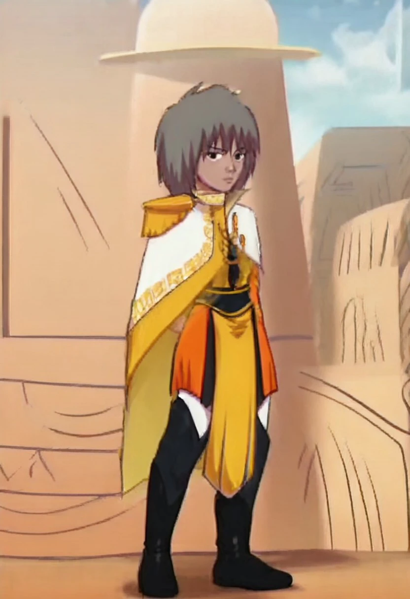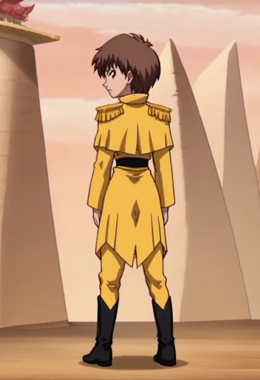 tags for her is: 1girl,epaulettes,cape, boots,brown eyes