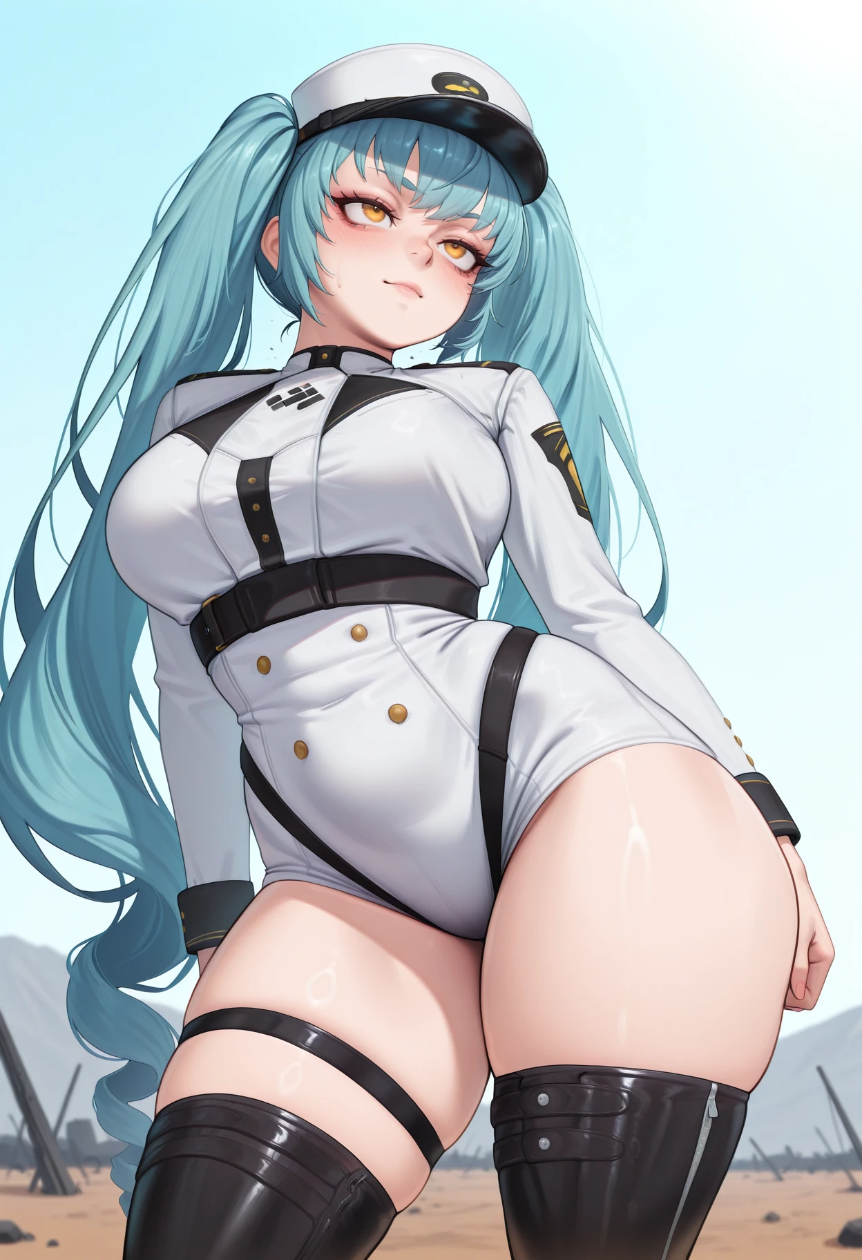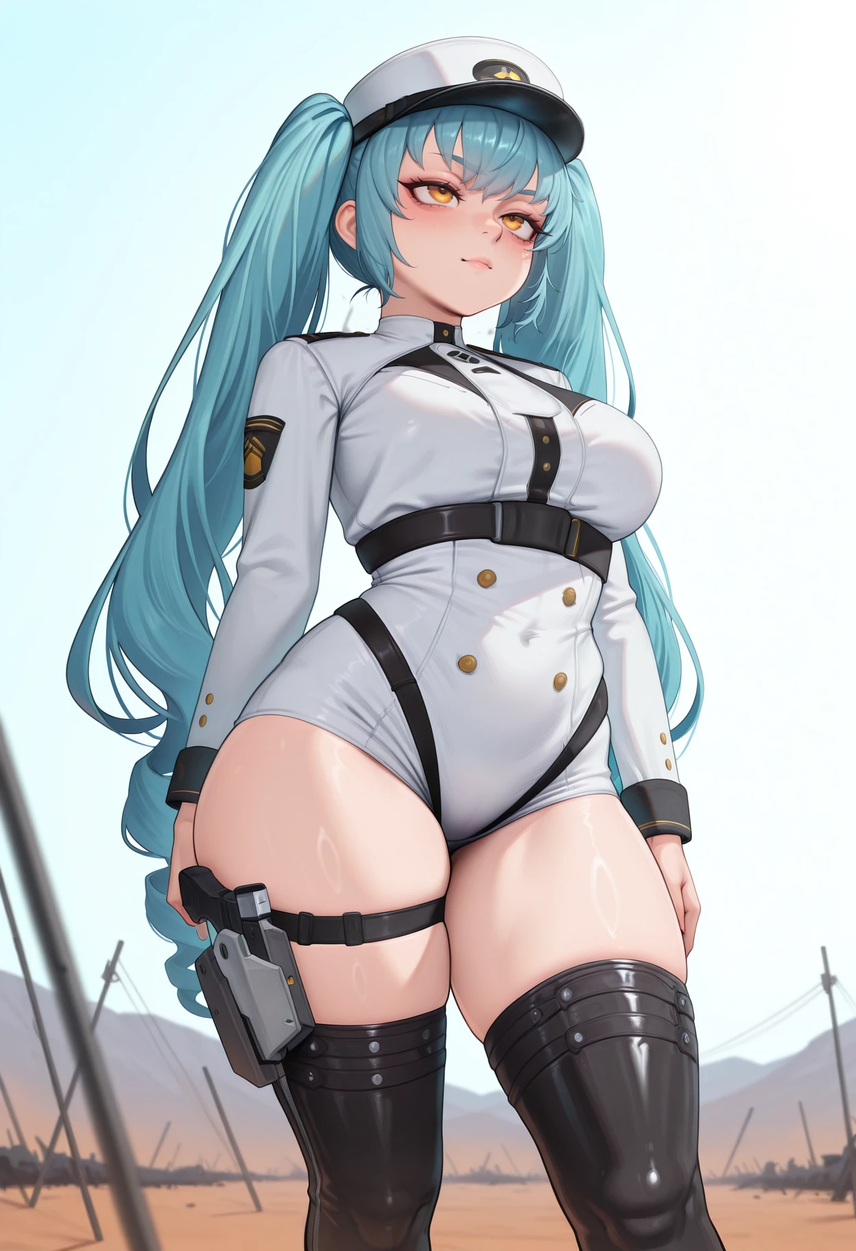 nikke_privaty, twintails, long hair, hat, yellow eyes, military uniform, large breasts, boots, thigh boots, blue hair, peaked cap, drill hair, thigh strap, long sleeves,