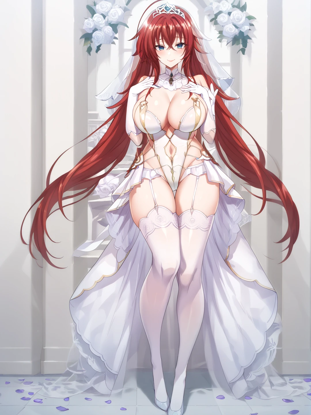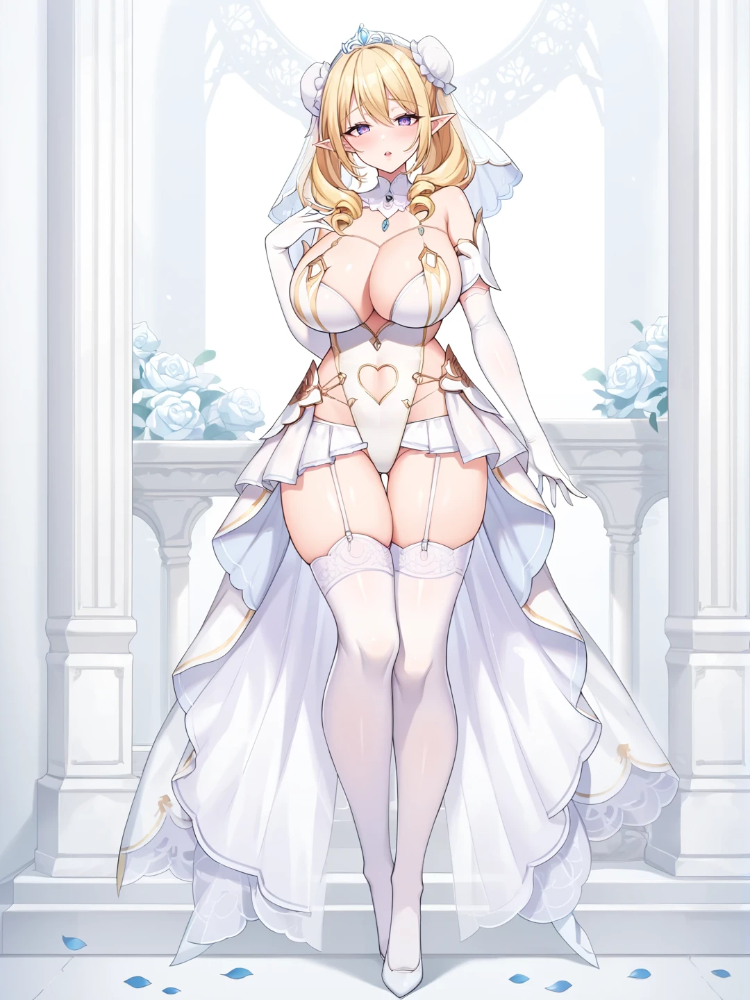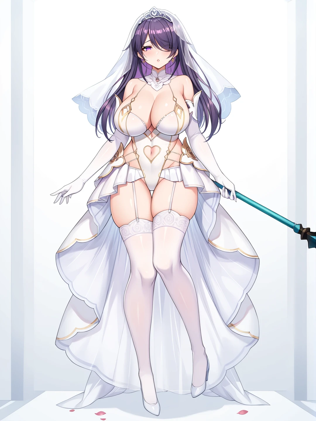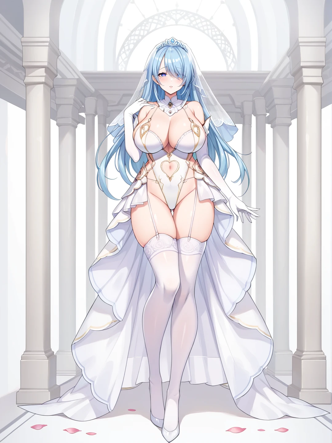 1girl, solo, large breasts, thighhighs, gloves, dress, navel, holding, cleavage, full body, elbow gloves, white gloves, huge breasts, white thighhighs, leotard, petals, clothing cutout, highleg, garter straps, tiara, veil, wedding dress, white leotard, bridal veil, showgirl skirt