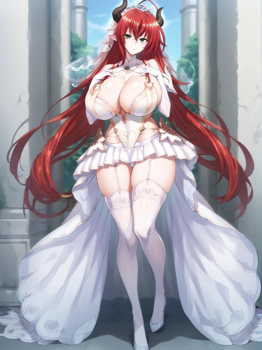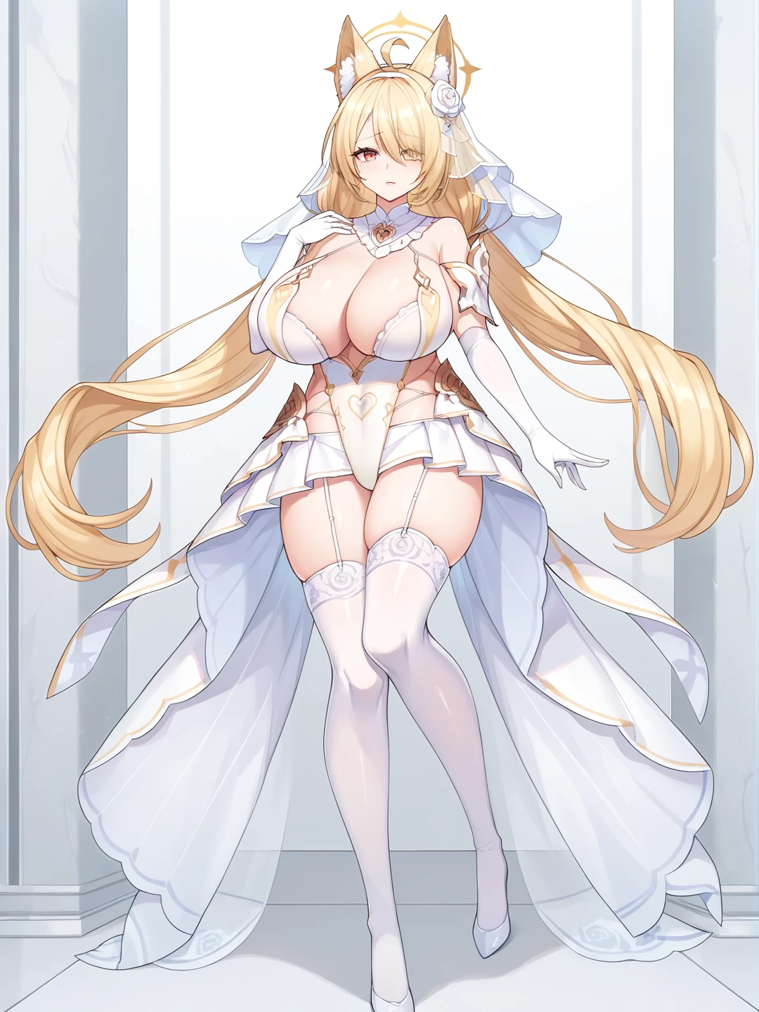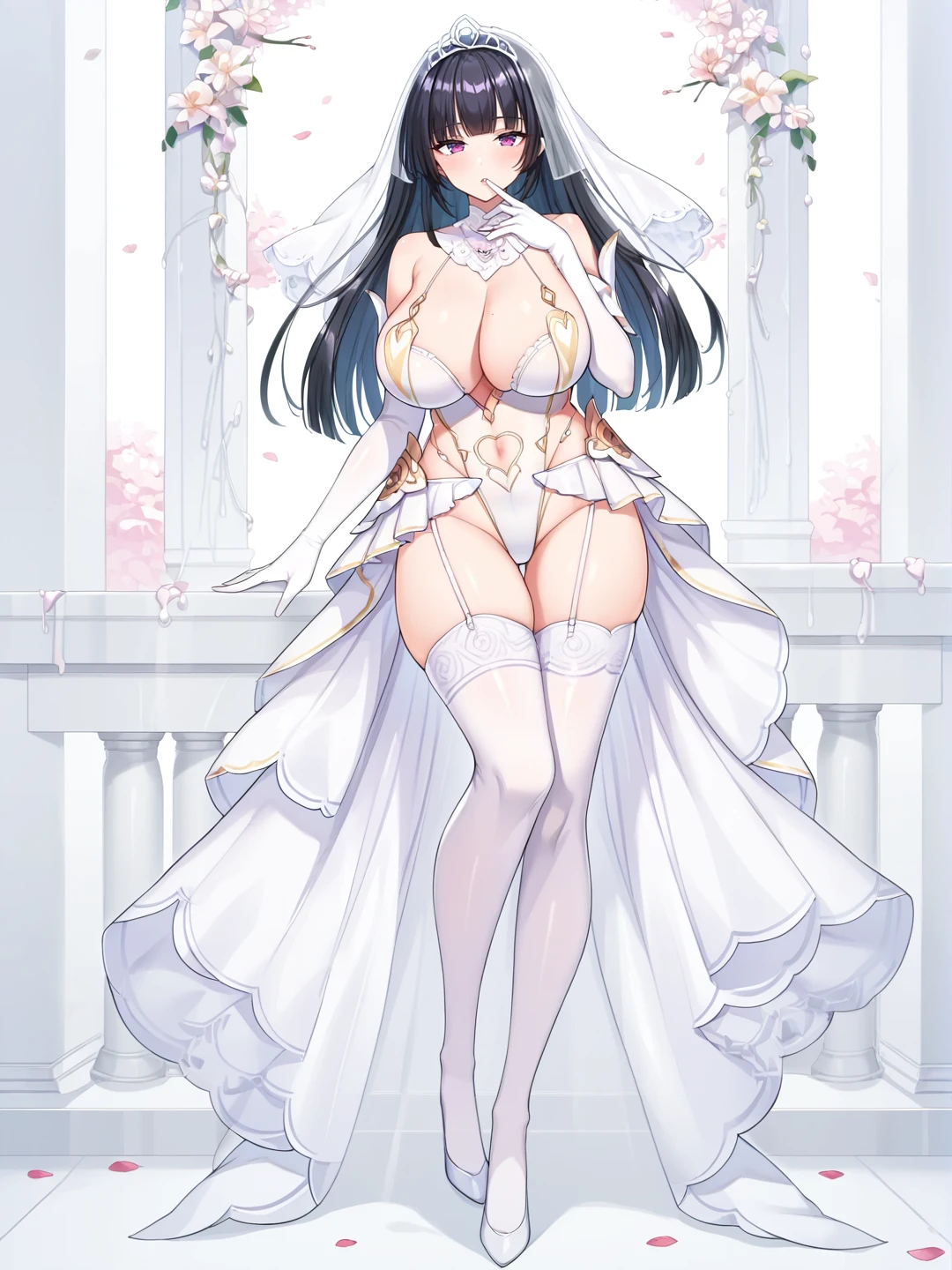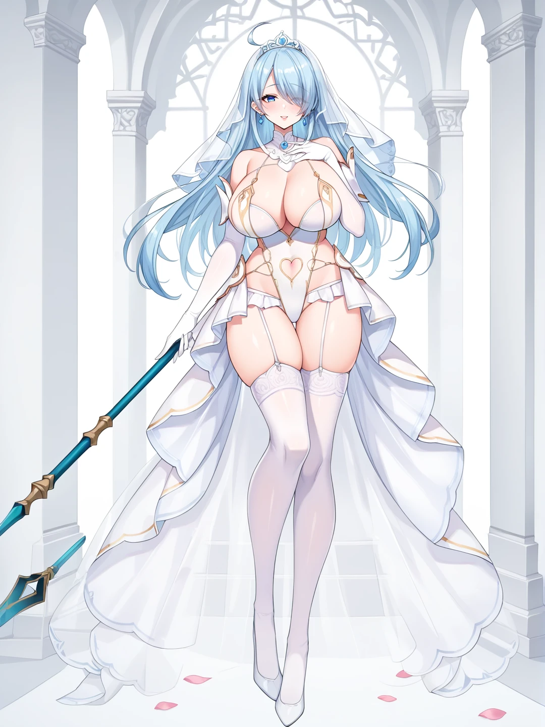 1girl, solo, large breasts, thighhighs, gloves, dress, navel, holding, cleavage, full body, elbow gloves, white gloves, huge breasts, white thighhighs, leotard, petals, clothing cutout, highleg, garter straps, tiara, veil, wedding dress, white leotard, bridal veil, showgirl skirt