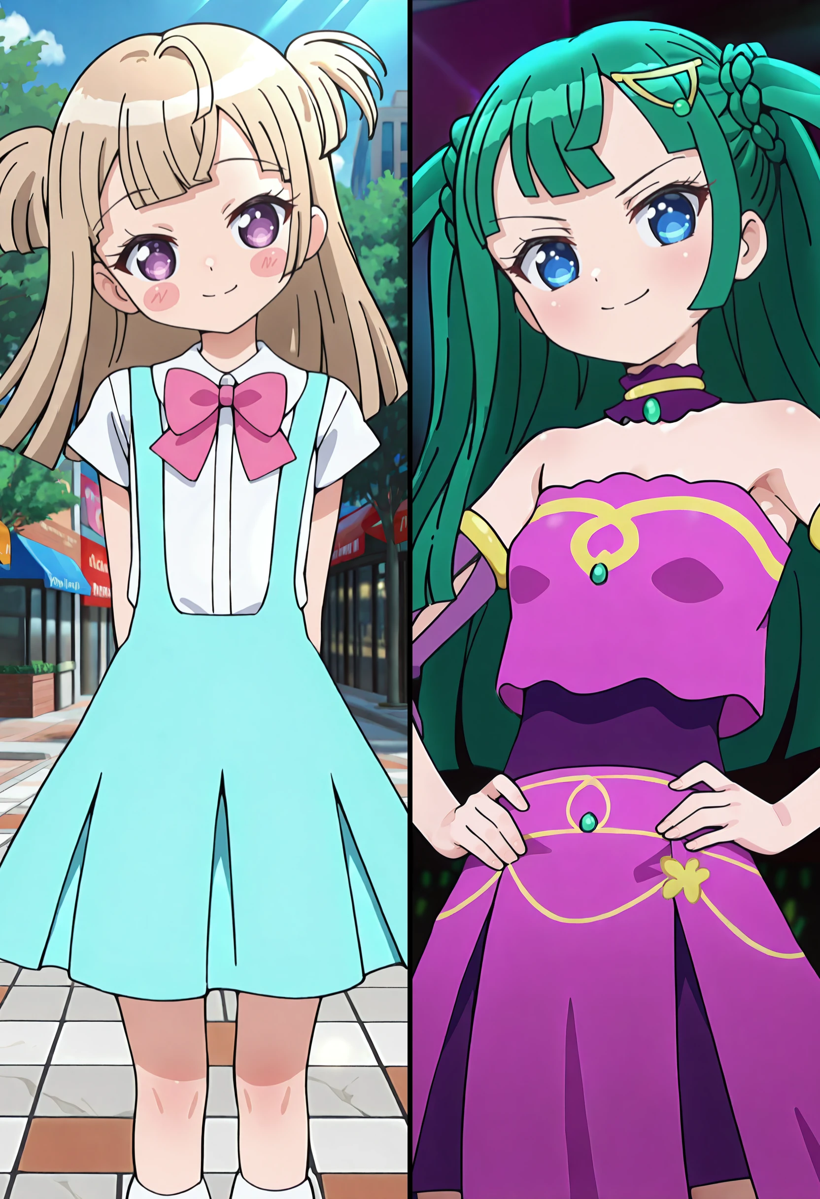 I'm about 60% done collecting materials for my next collection, so in the mean time I'm going to take care of some requests that have caught my eye from the anonymous request form (https://forms.gle/MiTznYpwpwBoGMWE8), starting with this character from PriPara! It's been a while since I did a 2-in-1 style LoRA, but this character has a 2nd completely different look/form.. so I thought that would be a fun model to make!