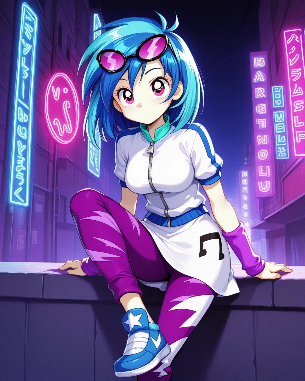 vs-mlp, equestria girls, white body, pink eyes, multicolored hair, blue hair with aqua streak, sunglasses, black-framed eyewear, purple-tinted eyewear, white jacket with blue trim, purple arm warmers, white skirt, purple pants, blue sneakers