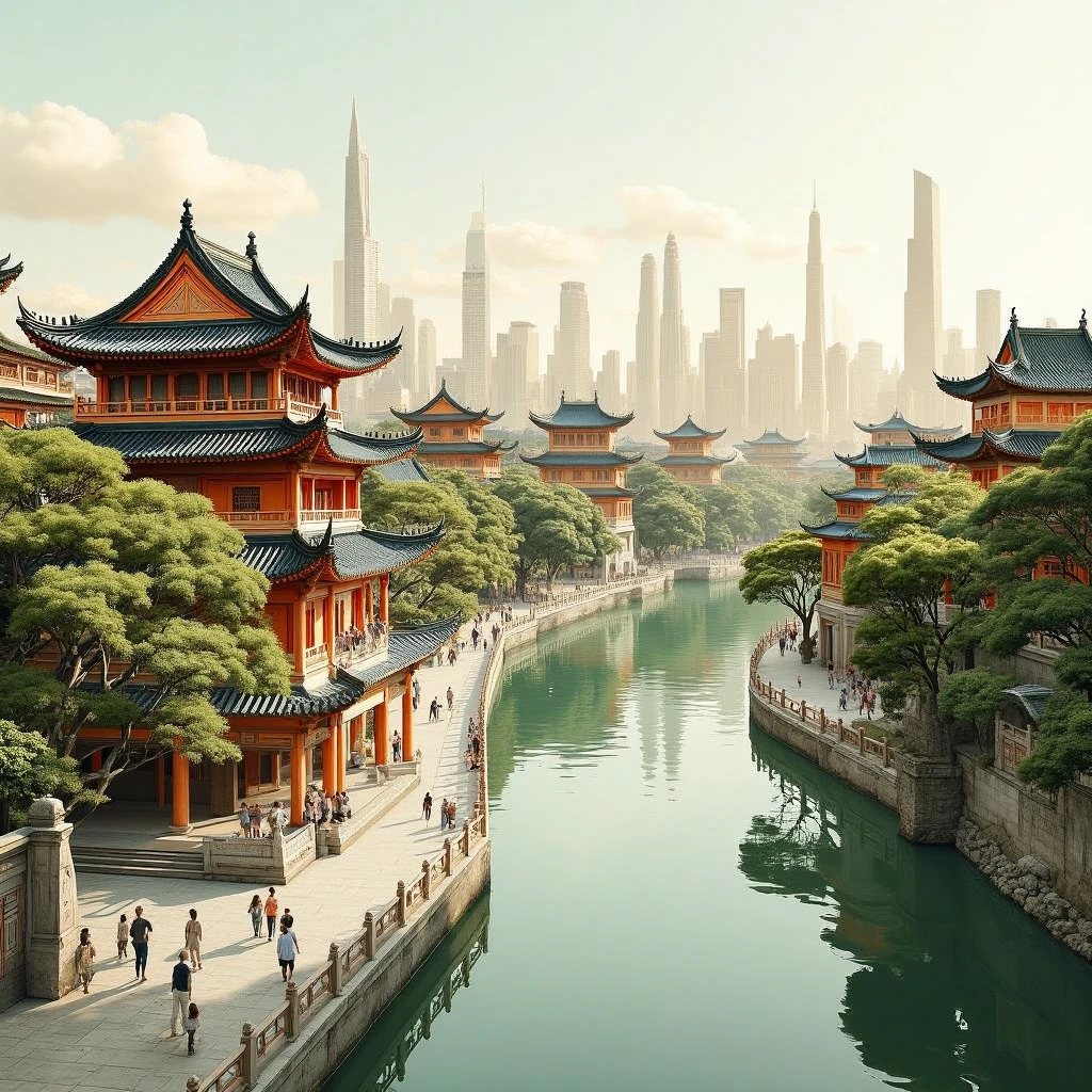 3. Traditional Chinese architectural style with rivers, multi - layered towers, blooming lotus, willow trees, sunset glow, golden reflections on water.