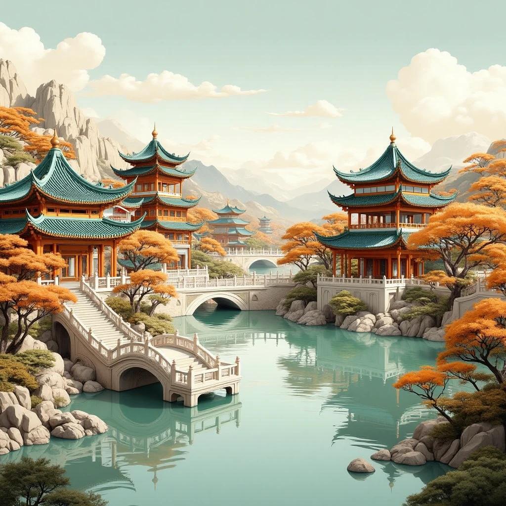 1. Traditional Chinese architectural style with rivers, pagodas and bridges, autumn trees, misty atmosphere, ink - wash painting effect, soft sunlight.