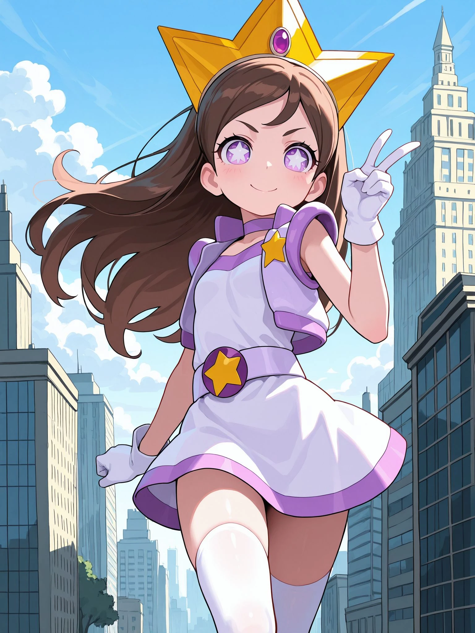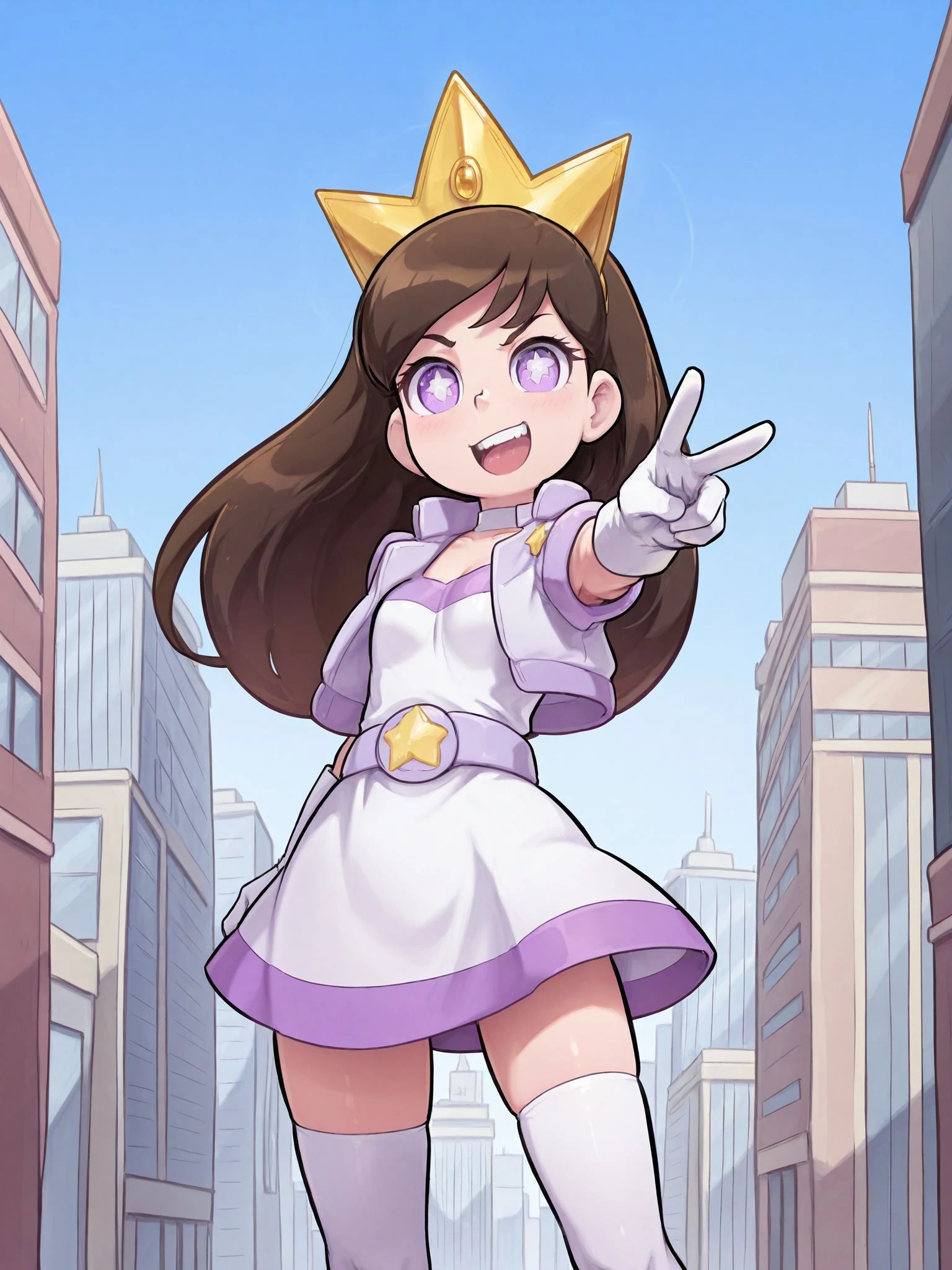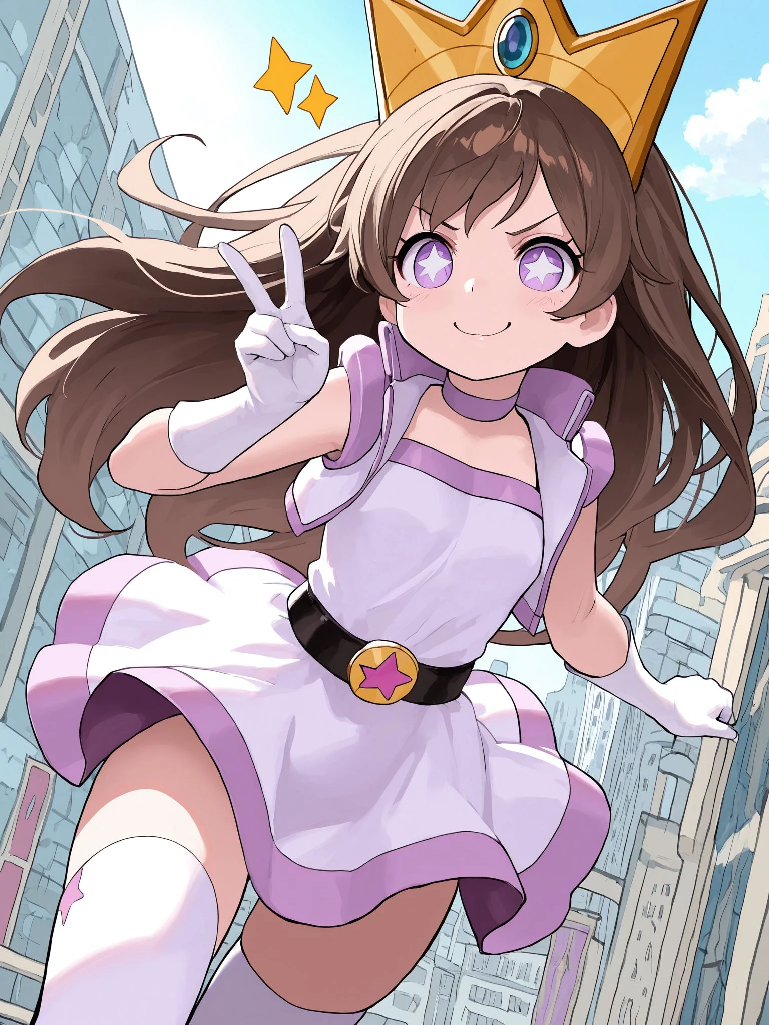 Dutchess Morbucks from The Powerpuff Girls ZCharacter Tags: brown hair, long hair, + +, purple eyesOutfit Tags: gloves, thighhighs, star (symbol), dress, white gloves, belt, crown