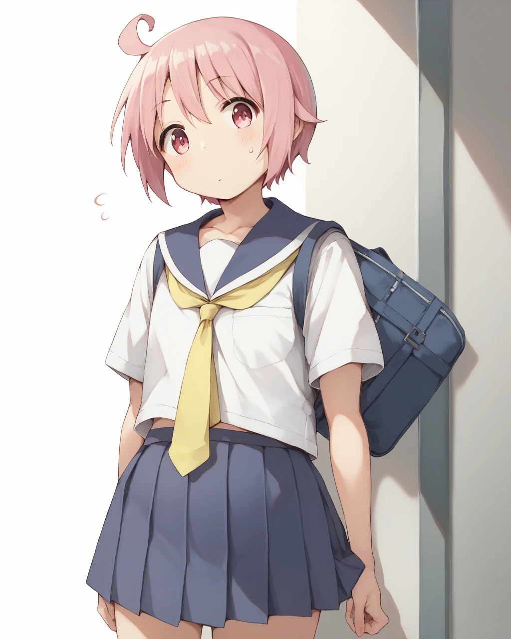 nonohara yuzuko,1girl, solo, pink hair, short hair, ahoge, pink eyes,bangs,school uniform, serafuku,, blue sailor collar,, pleated skirt, yellow necktie,