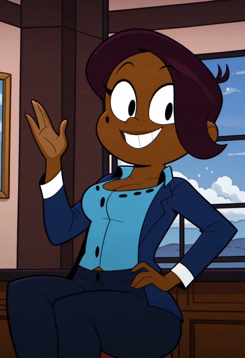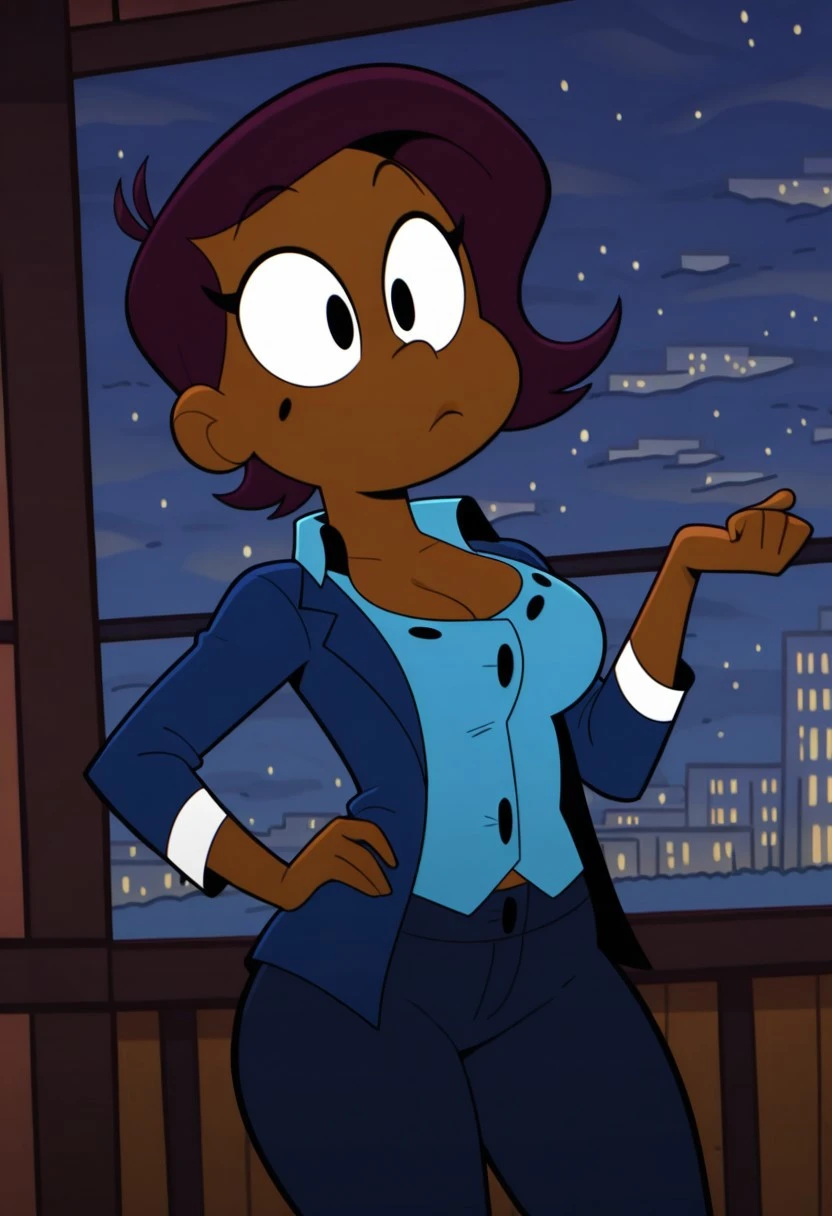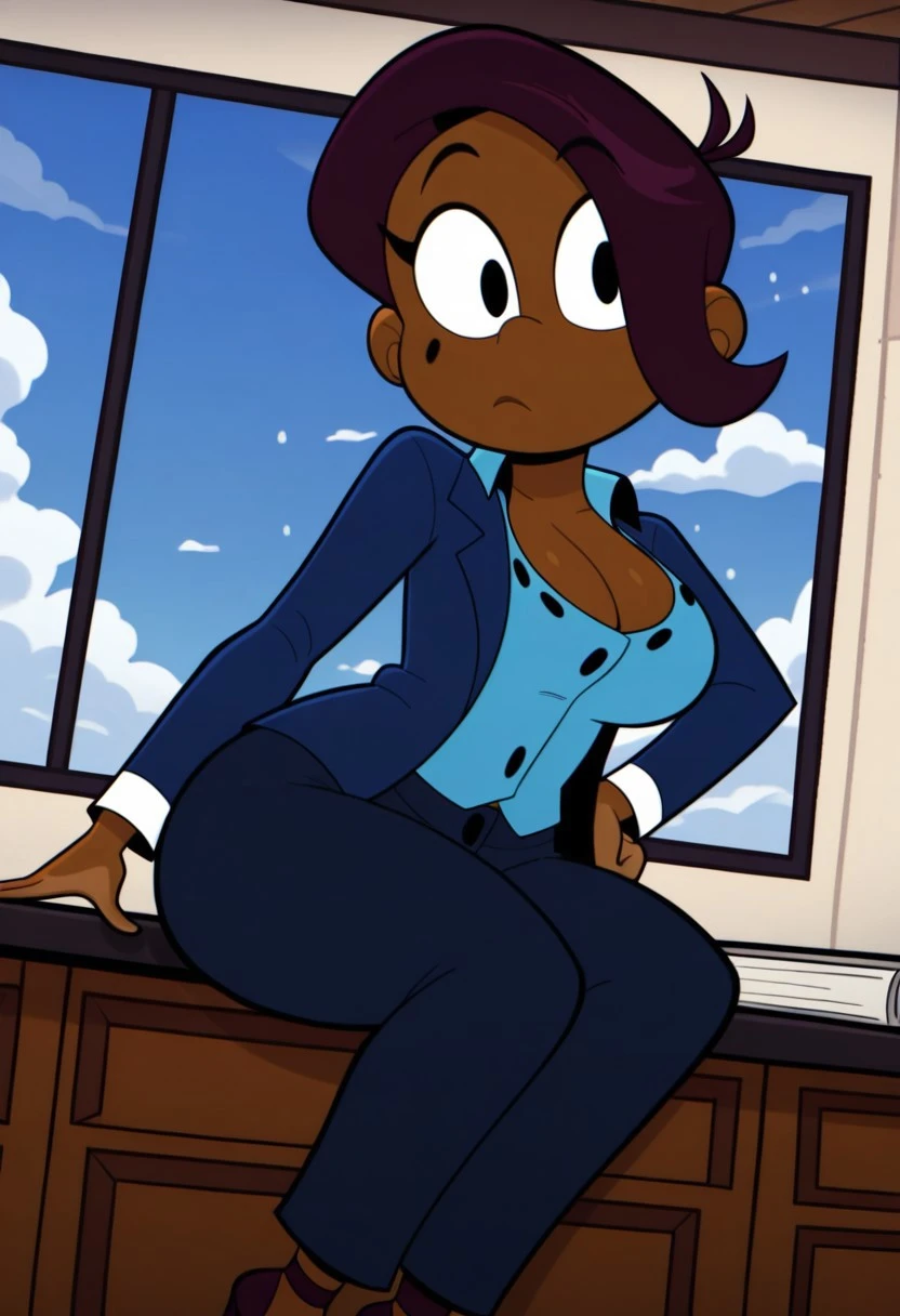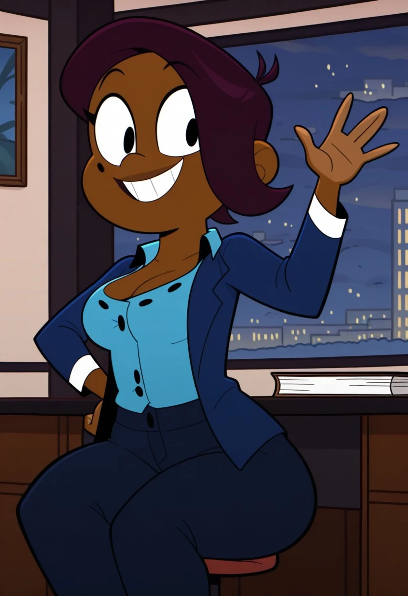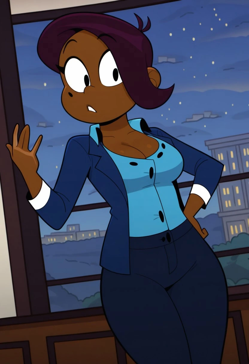 Base Prompt: millie martins, dark skin, mole, dark purple hair, blue shirt, dark blue jacket, dark blue pants, dark purple heels