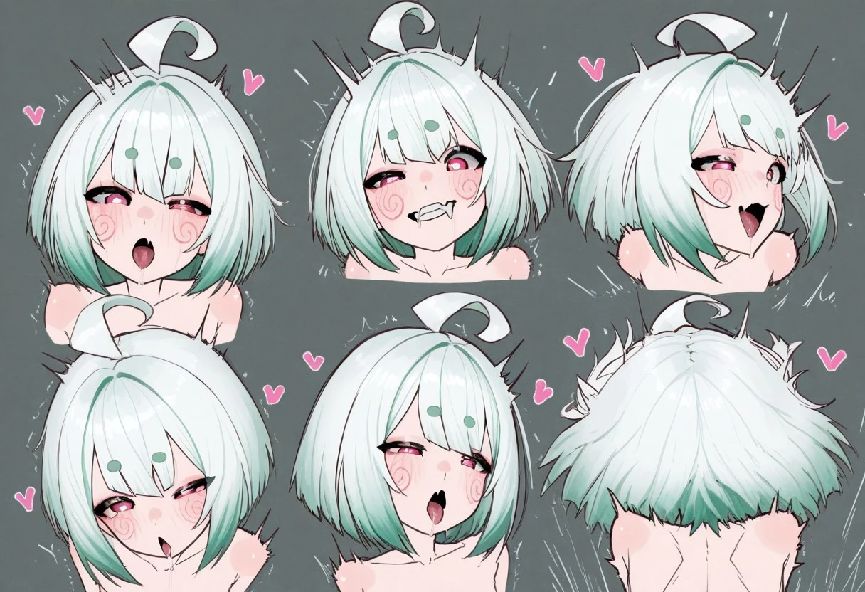 multiple expressions, sketch, 1girl, blush, hearts, ?????? silly, ahegao, motion lines, back, clenched teeth, profile, :o, saliva, :p, implied ???, head tilt, implied ????????, uneven eyes, head back, trembling, grey background, simple background
