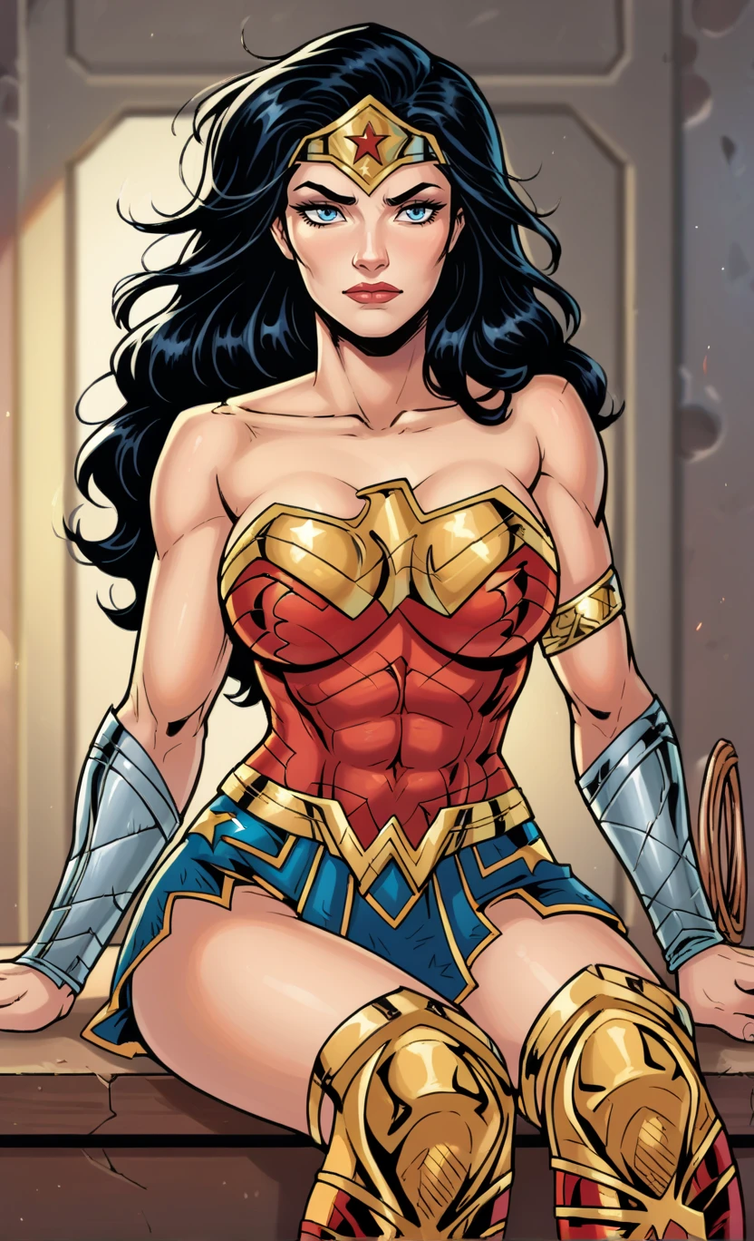 WonderwomanRB,1girl,solo,long hair,blue eyes,skirt,black hair,cleavage,bare shoulders,collarbone,armor,tiara,armlet,bracer,whip,superhero