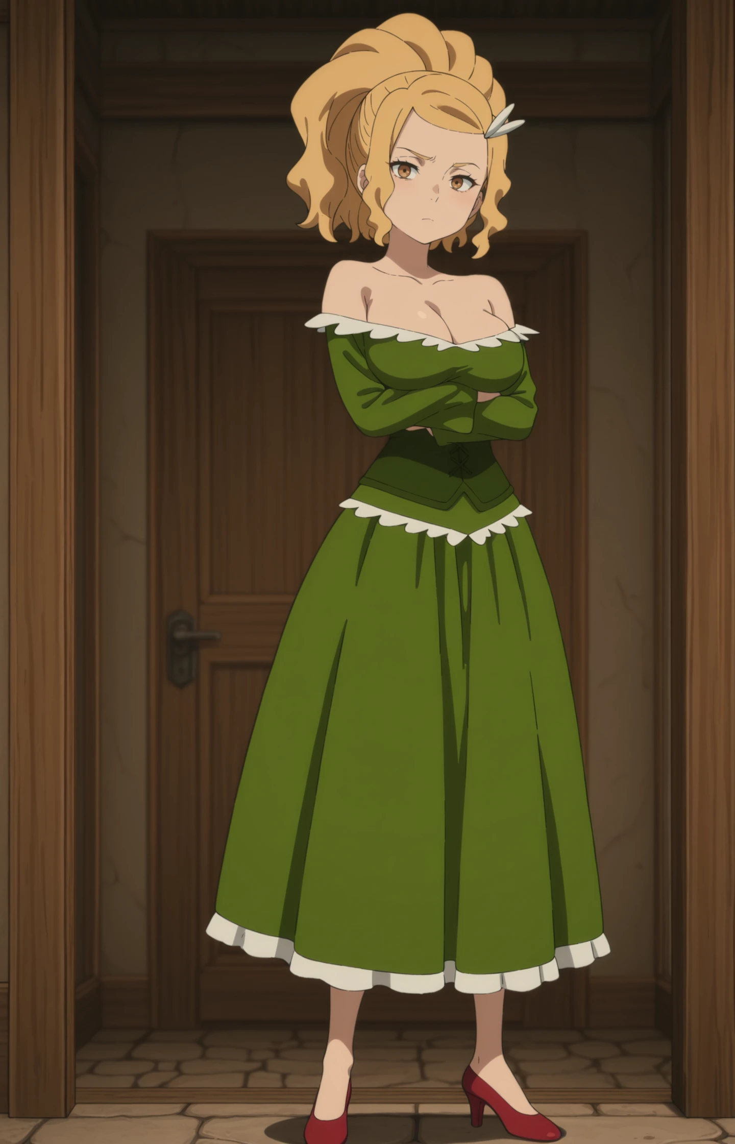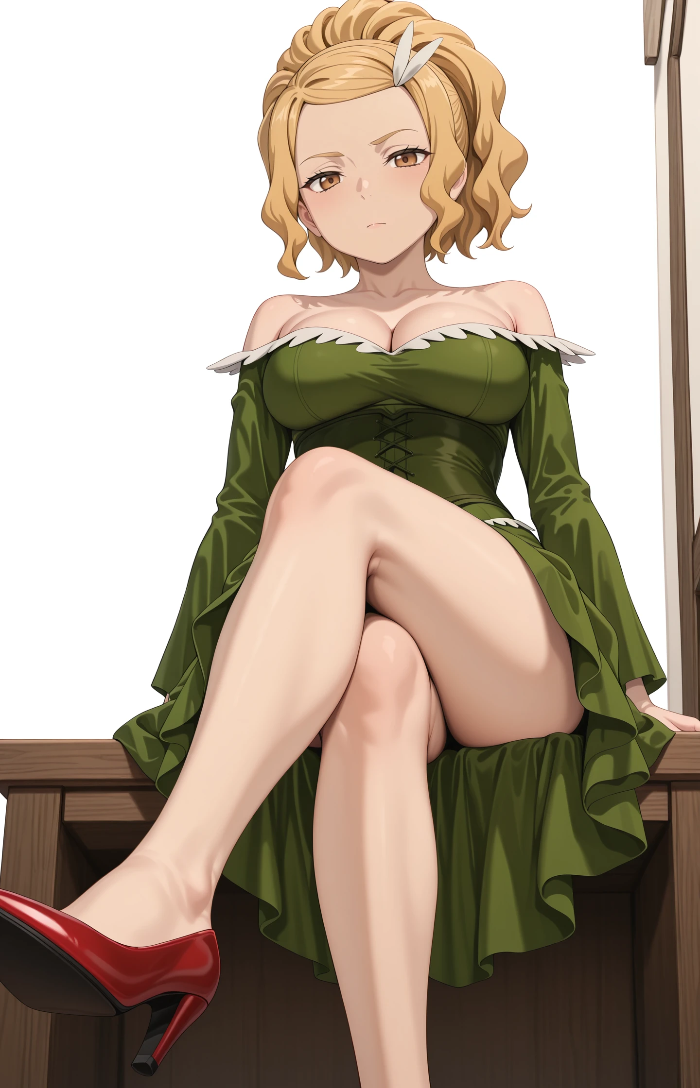 bare shoulders, off shoulder, long sleeves, green dress, cleavage, high heels, red shoesFlashback Outfit: