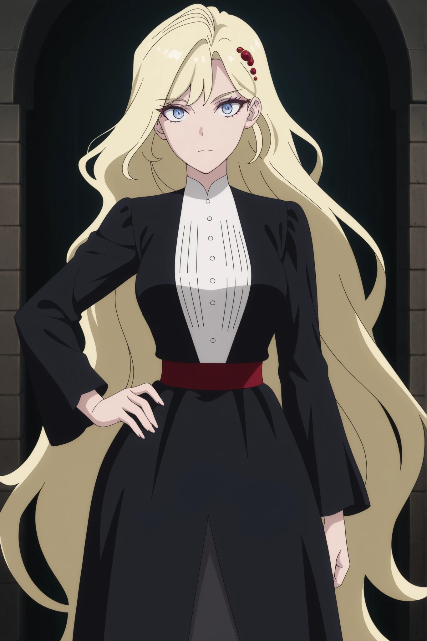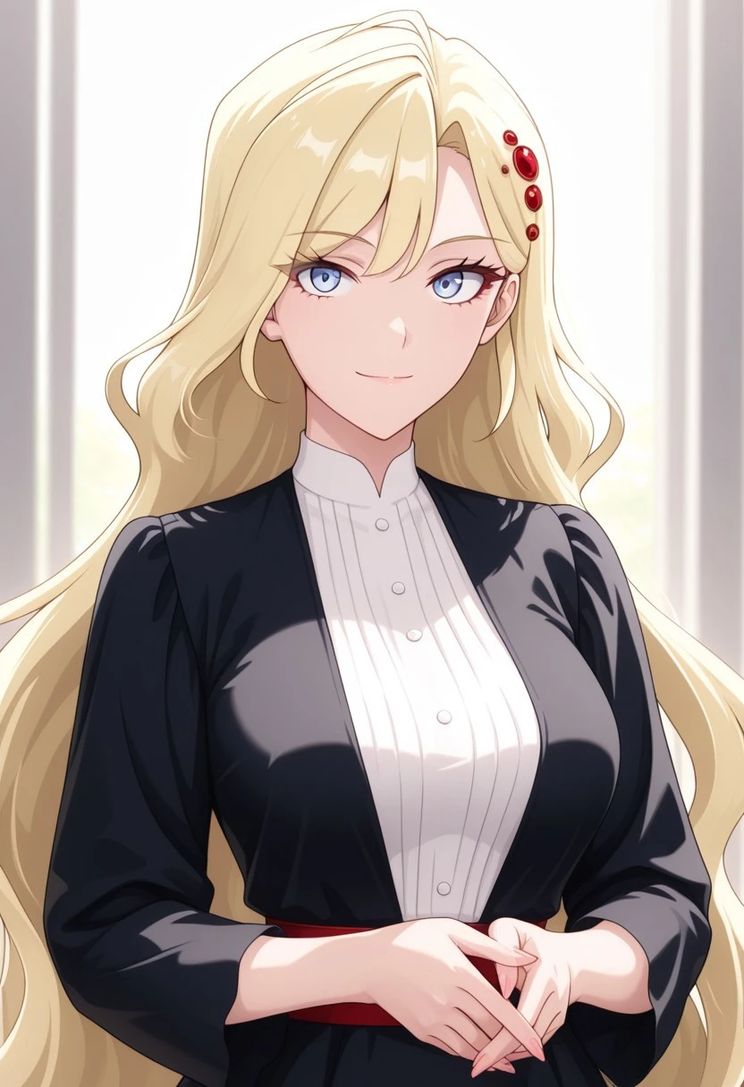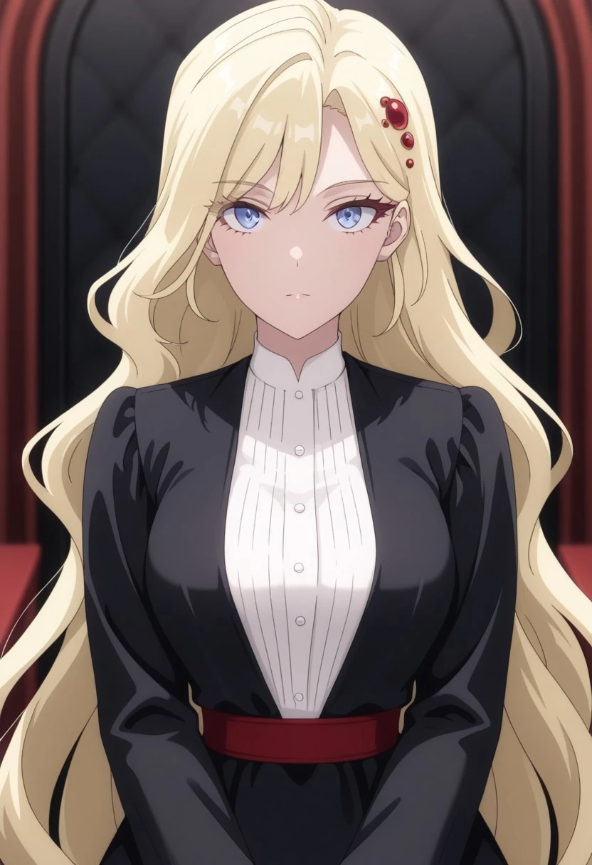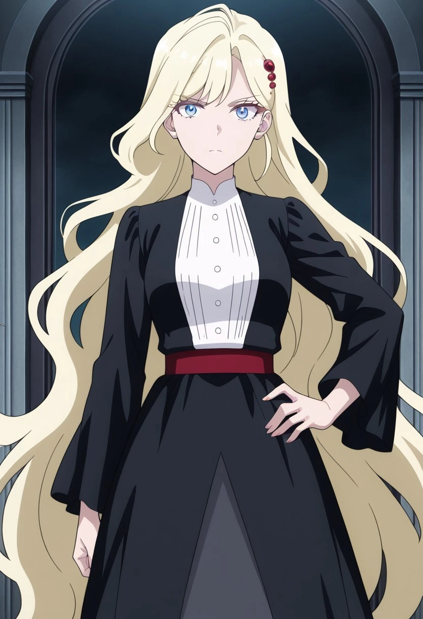 very long hair,blonde hair, hair ornament,blue eyes, black dress,