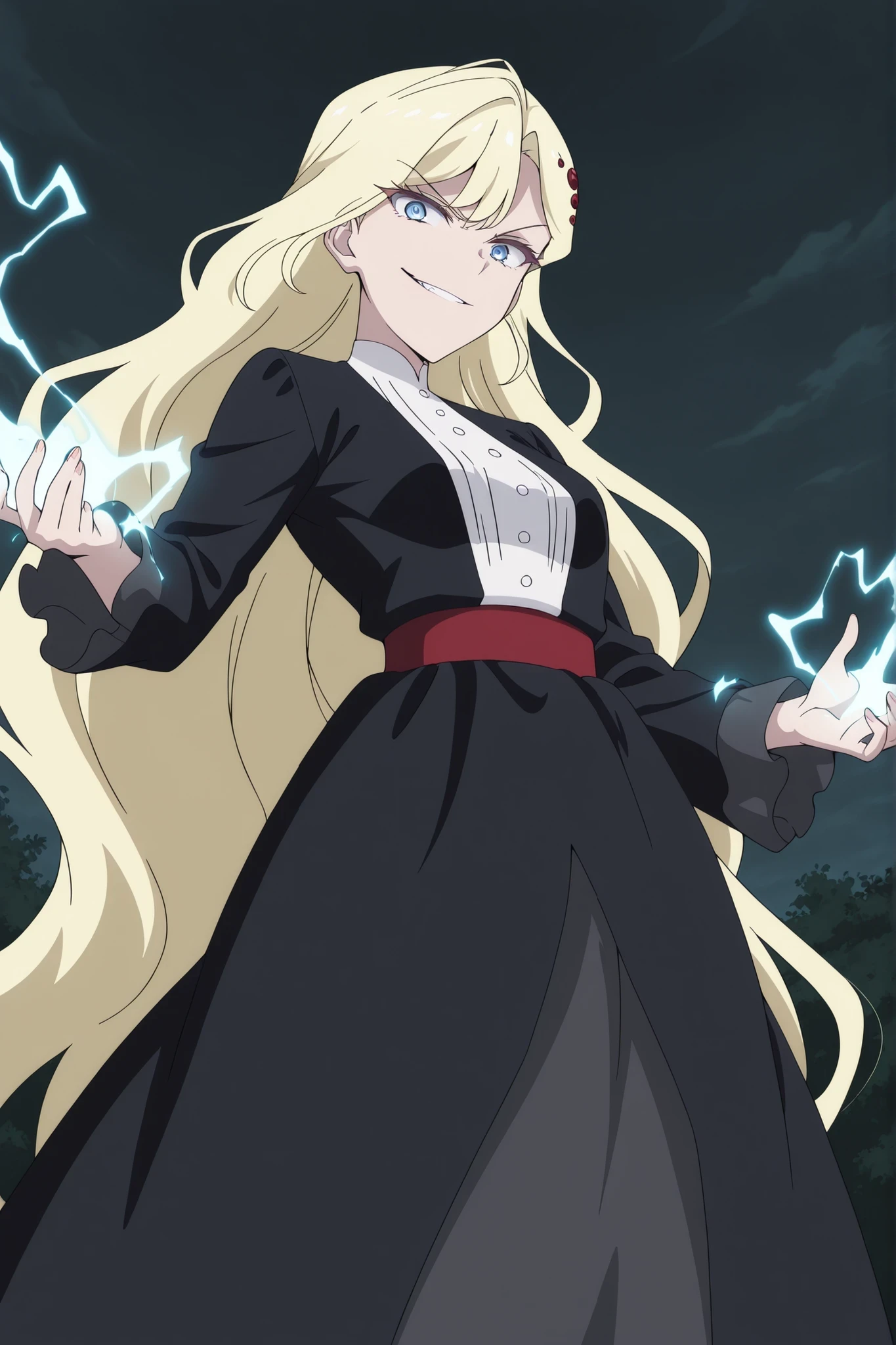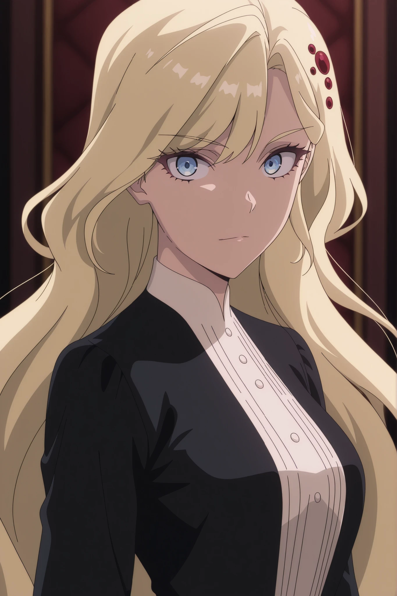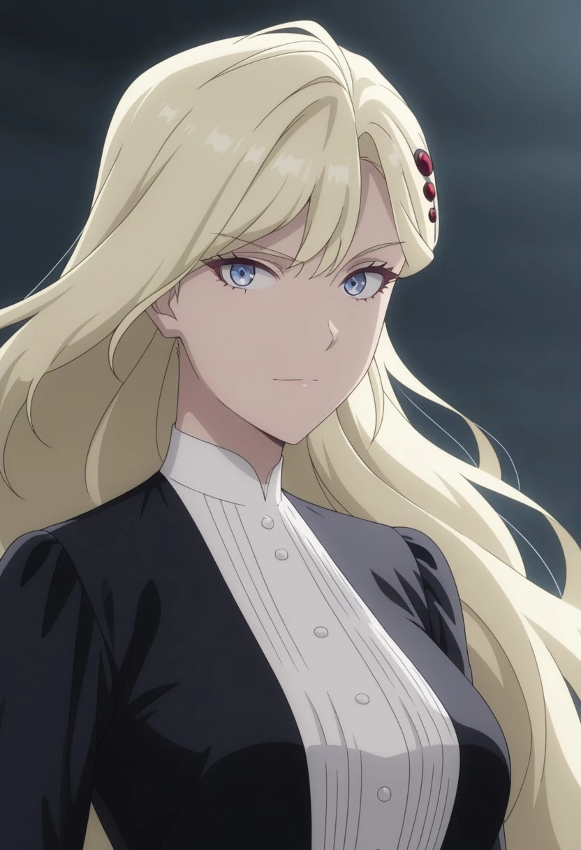 very long hair,blonde hair, hair ornament,blue eyes, black dress,