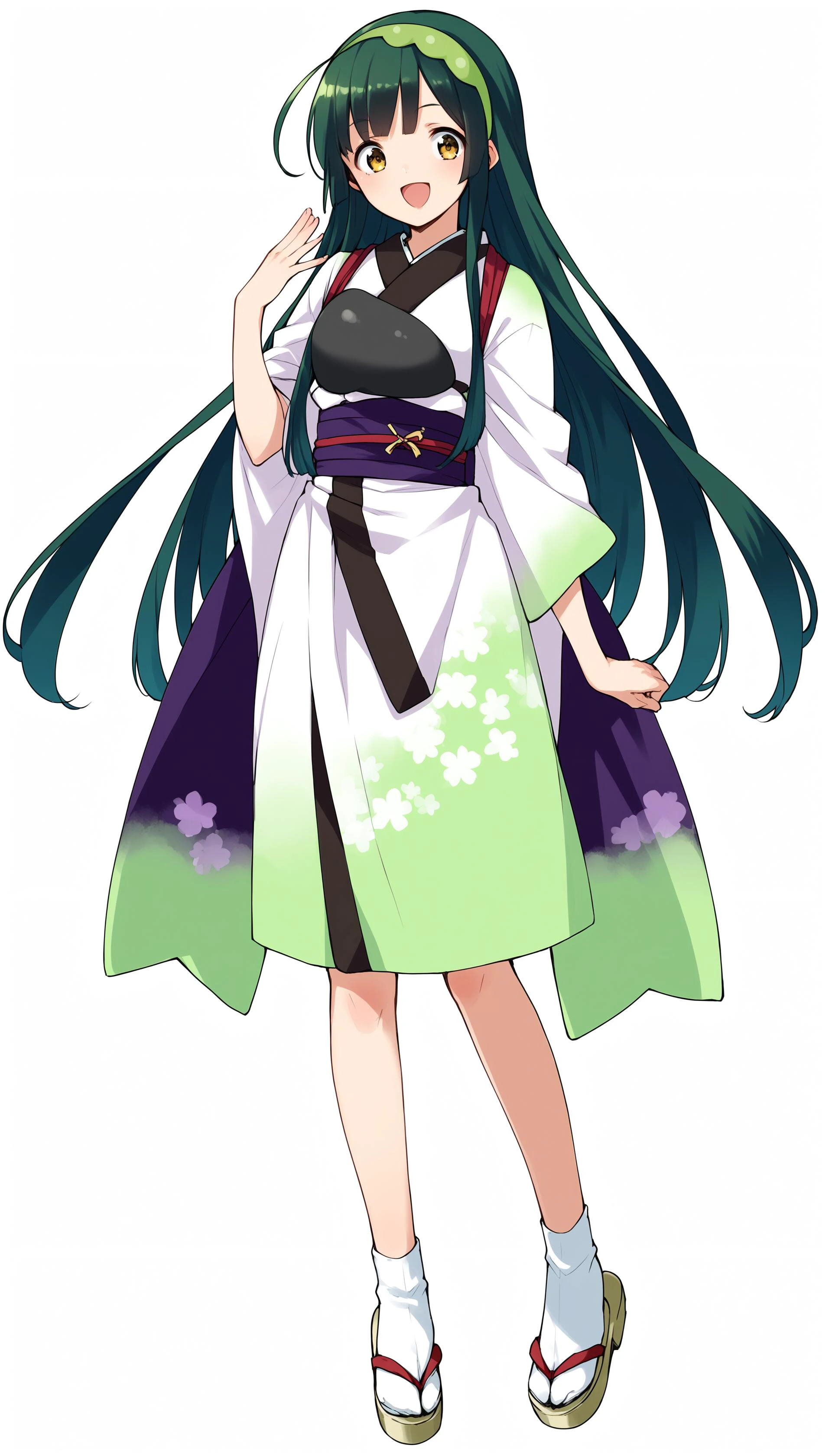 long hair, open mouth, very long hair, yellow eyes, ahoge, hairband, japanese clothes, green hair, socks, kimono, sash, obi, sandals, tabi, muneate, short kimono, green hairband