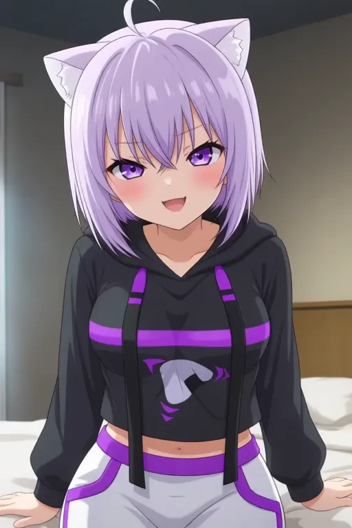 Trigger Word:Nekomata Okayu, anime-style girl. The image features an anime-style character with light purple hair styled in a high ponytail. The character has large, expressive purple eyes and cat ears on their head.The character is wearing a black hoodie with purple accents, including a purple drawstring and trim on the sleeves and pants. The hoodie is paired with white pants that have purple trim along the edges.