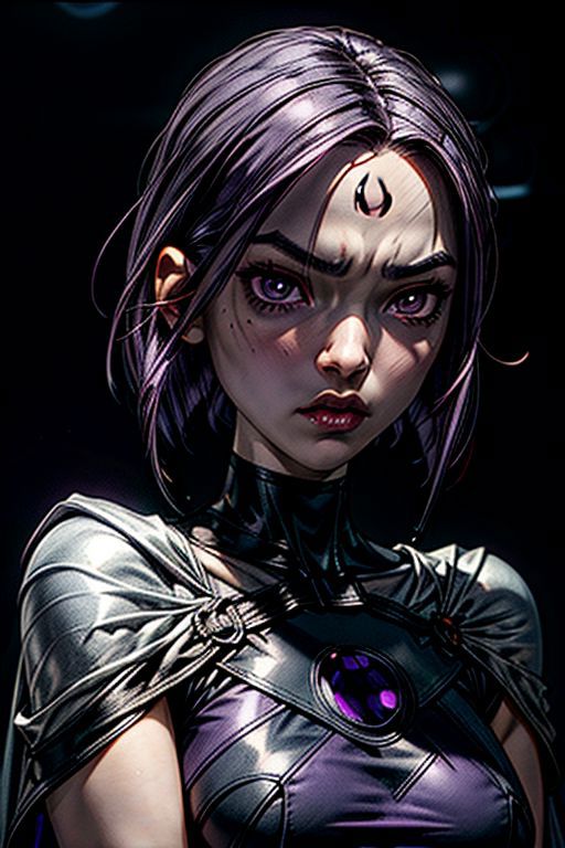 The main trigger words is purple hair, short hair, purple eyes, grey skin, colored skin, forehead jewel, leotard, belt, cape