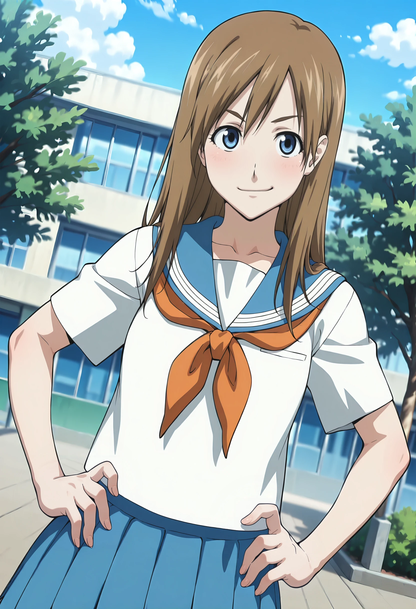 #1: white shirt, blue sailor collar, orange neckerchief, blue pleated skirt, dark blue socks, brown loafers