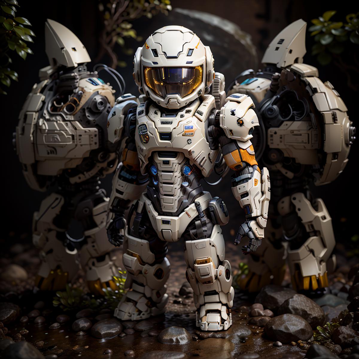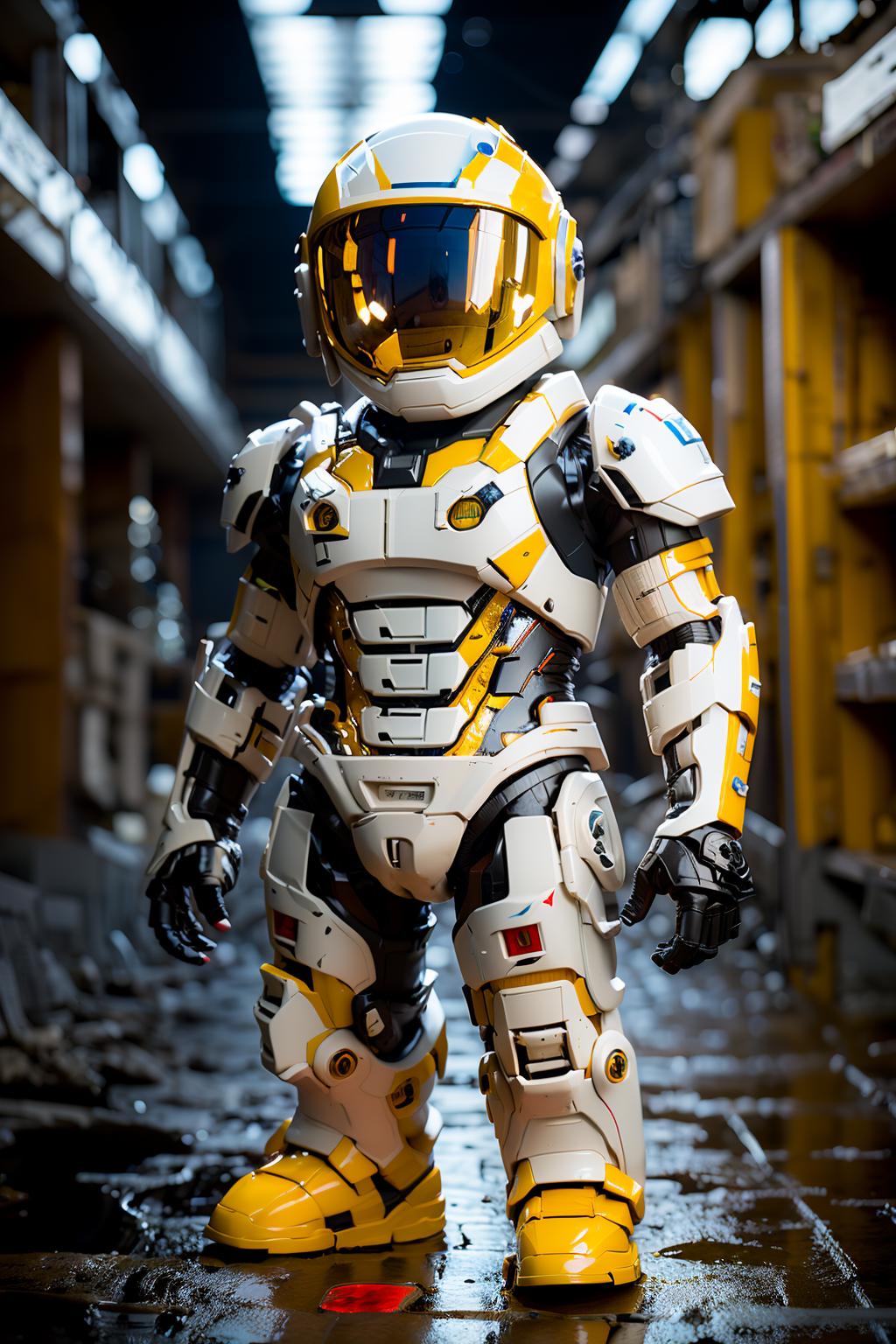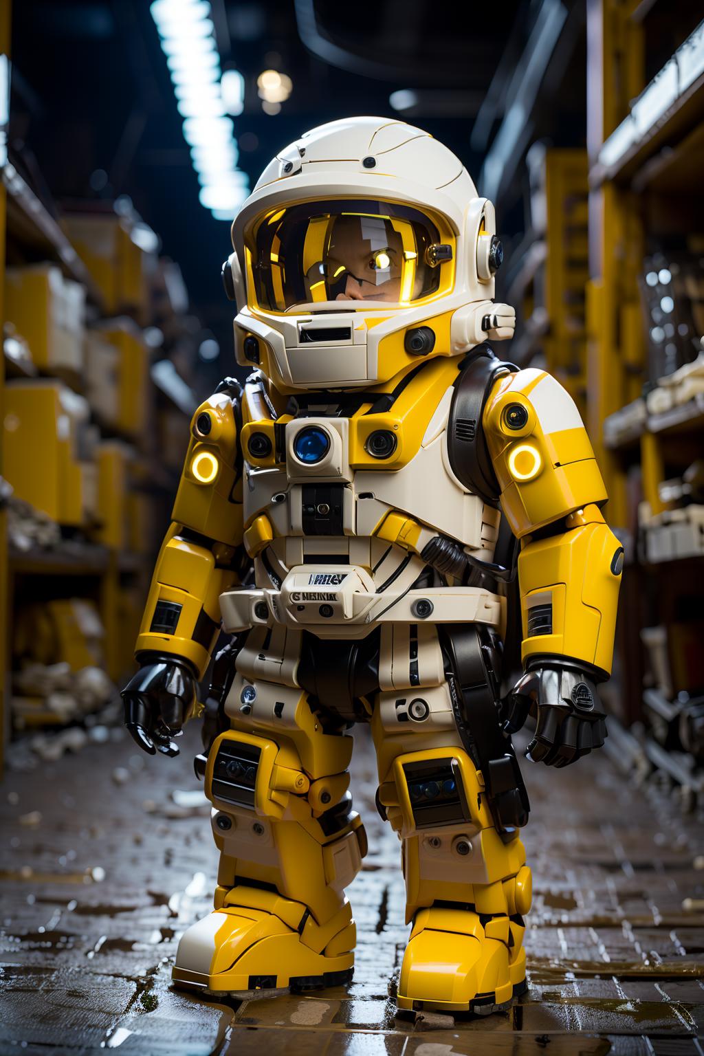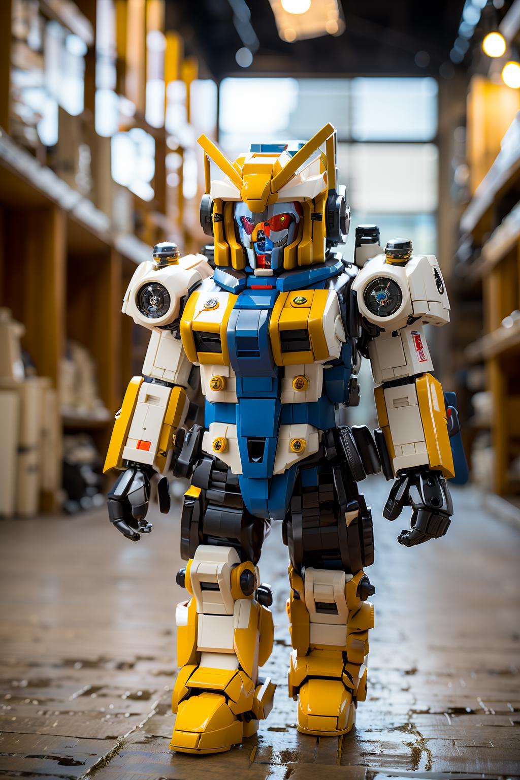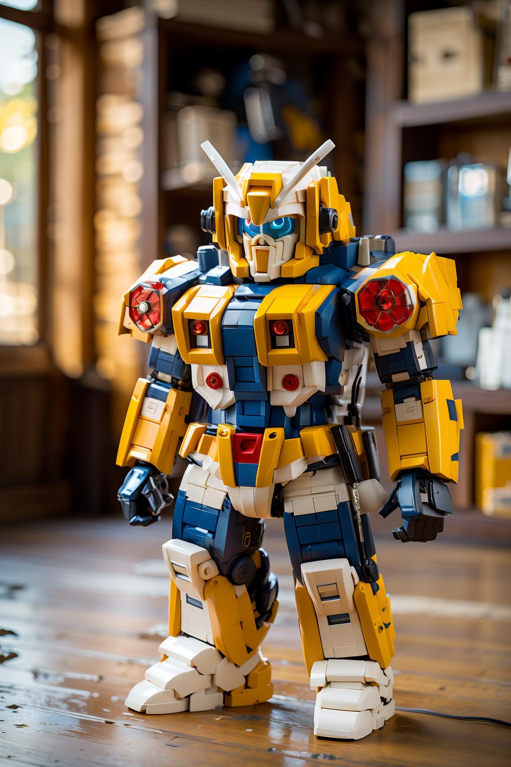 BJ_Lego bricks, solo, standing, yellow_eyes, chibi, no_humans, glowing, robot, mecha, glowing_eyes, science_fiction, open_hands, cinematic lighting,strong contrast,high level of detail,Best quality,masterpiece,White background,