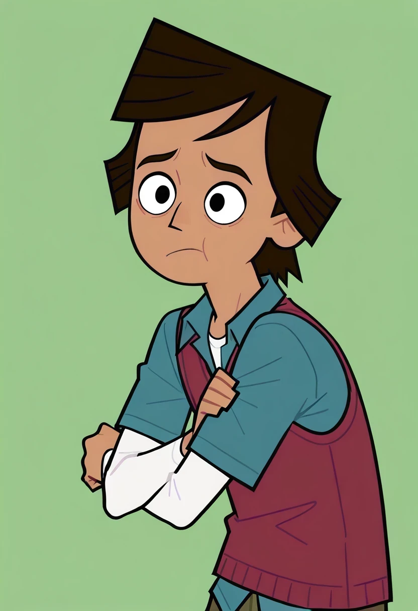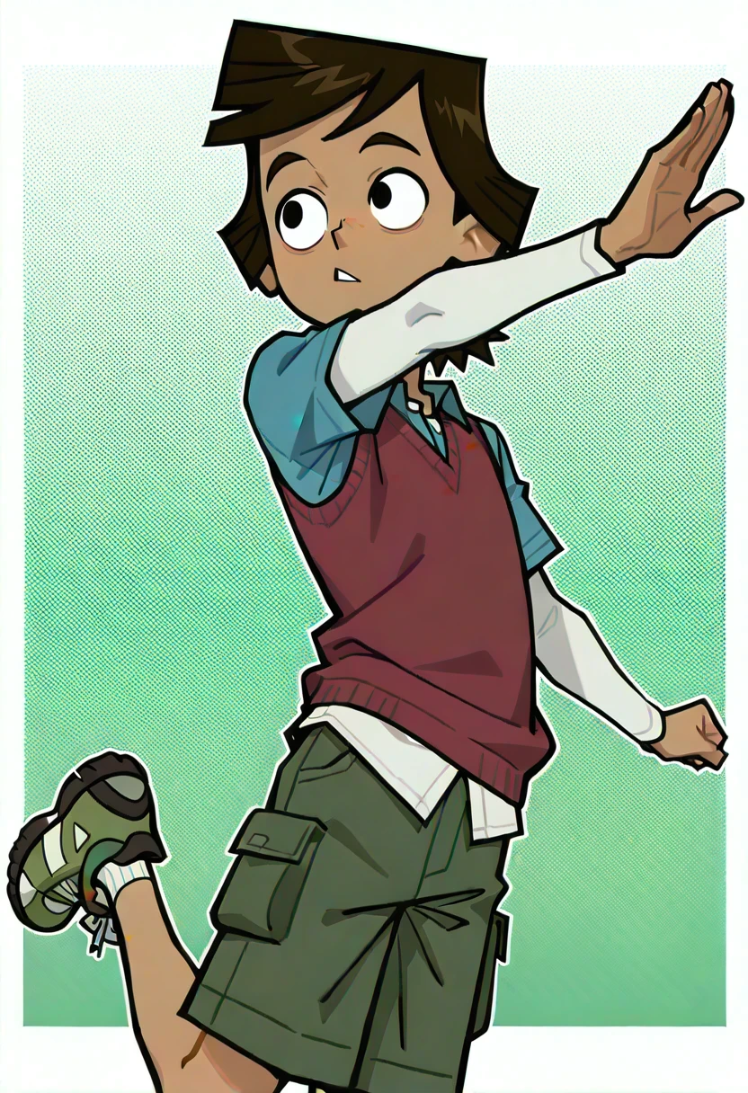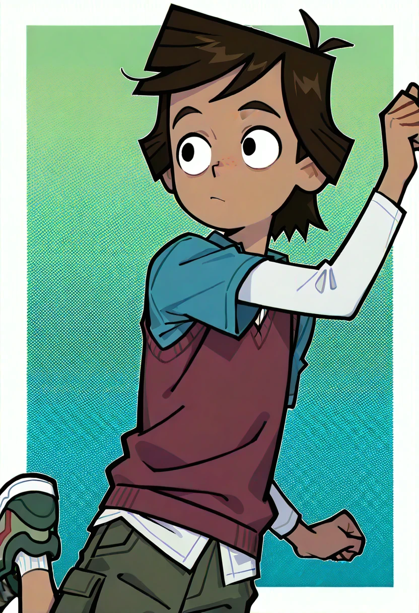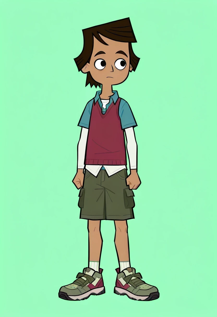 NoahTDR, 1boy, dark brown hair, blue short-sleeve shirt, white long-sleeve shirt, dark red vest, desaturated green cargo shorts, desaturated light green sneakers with orange and white details, tan skin, black eyes