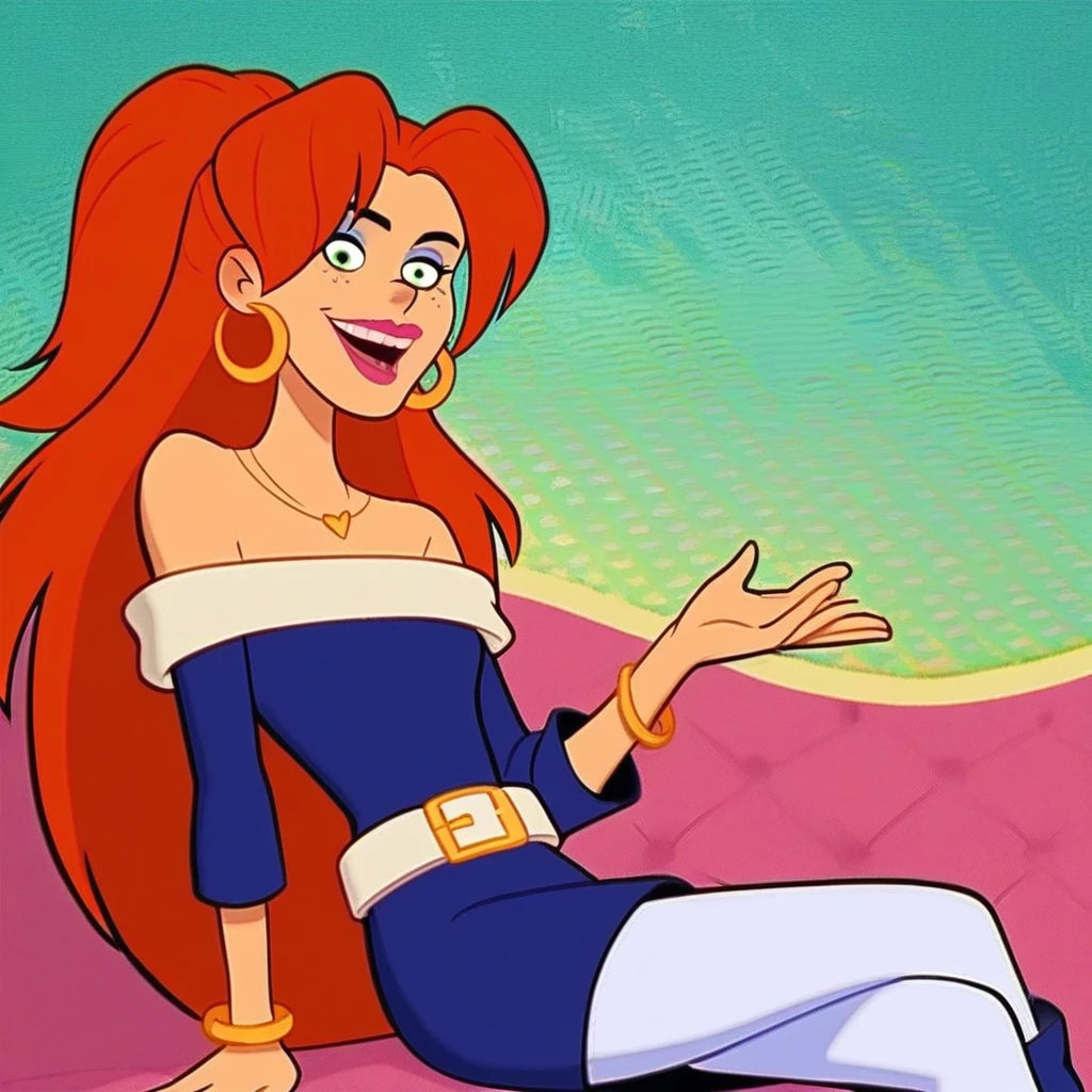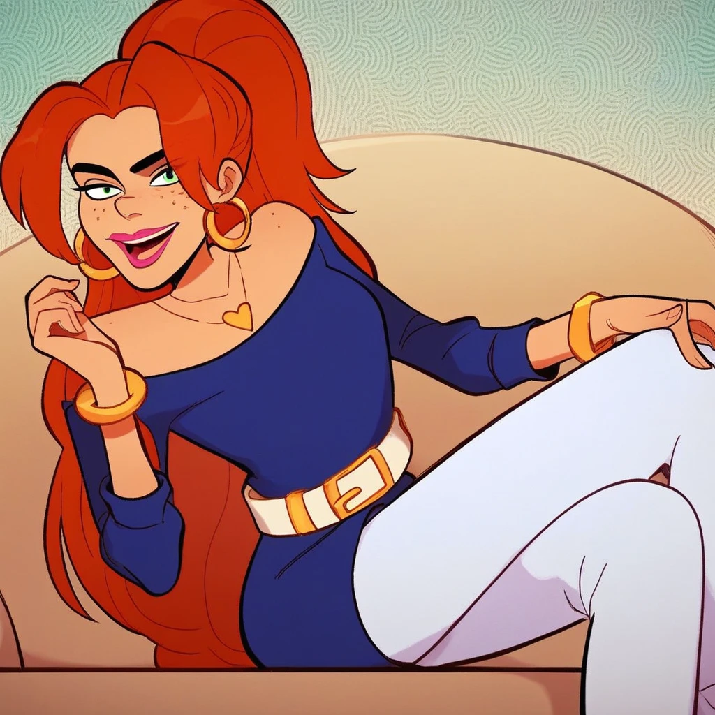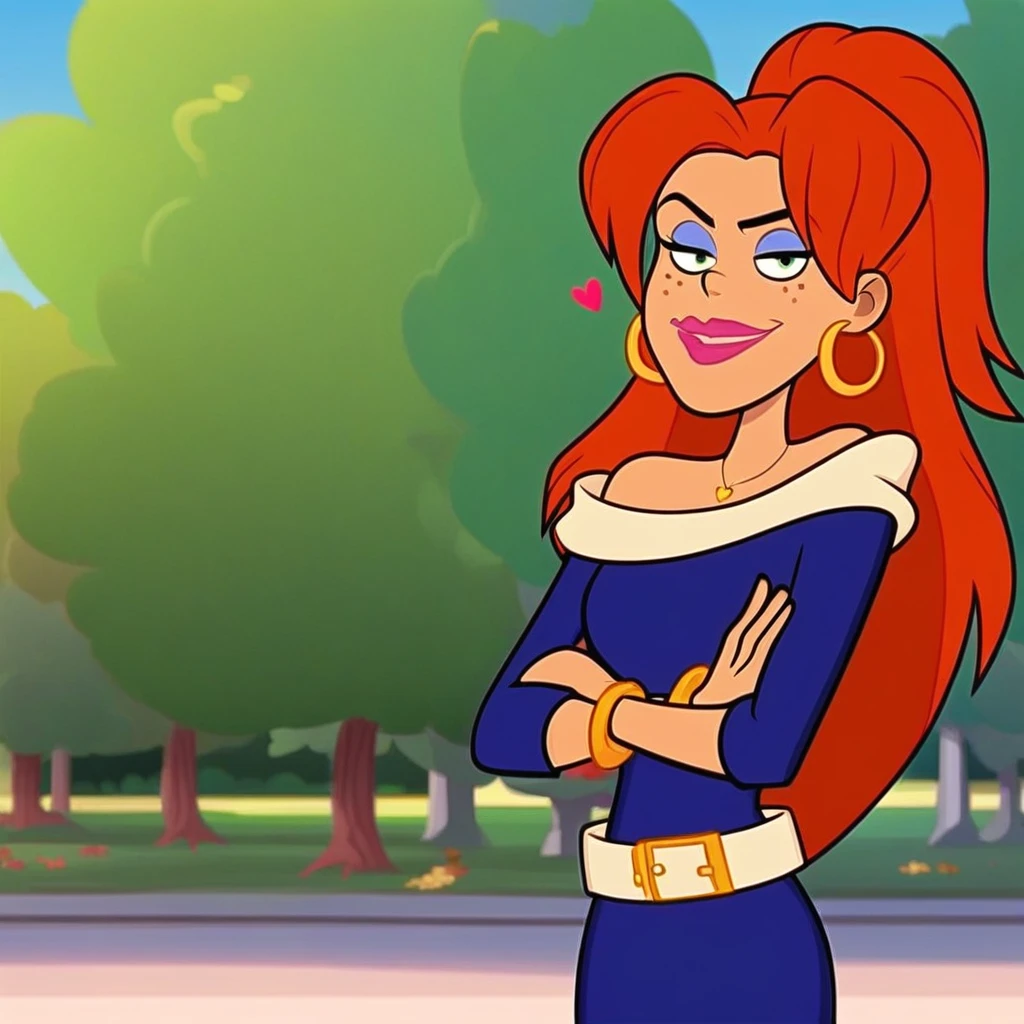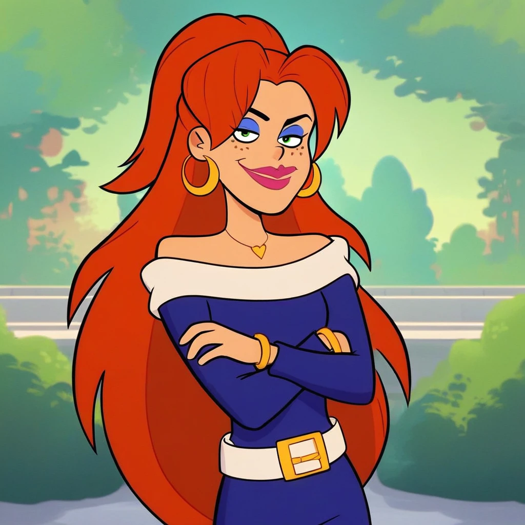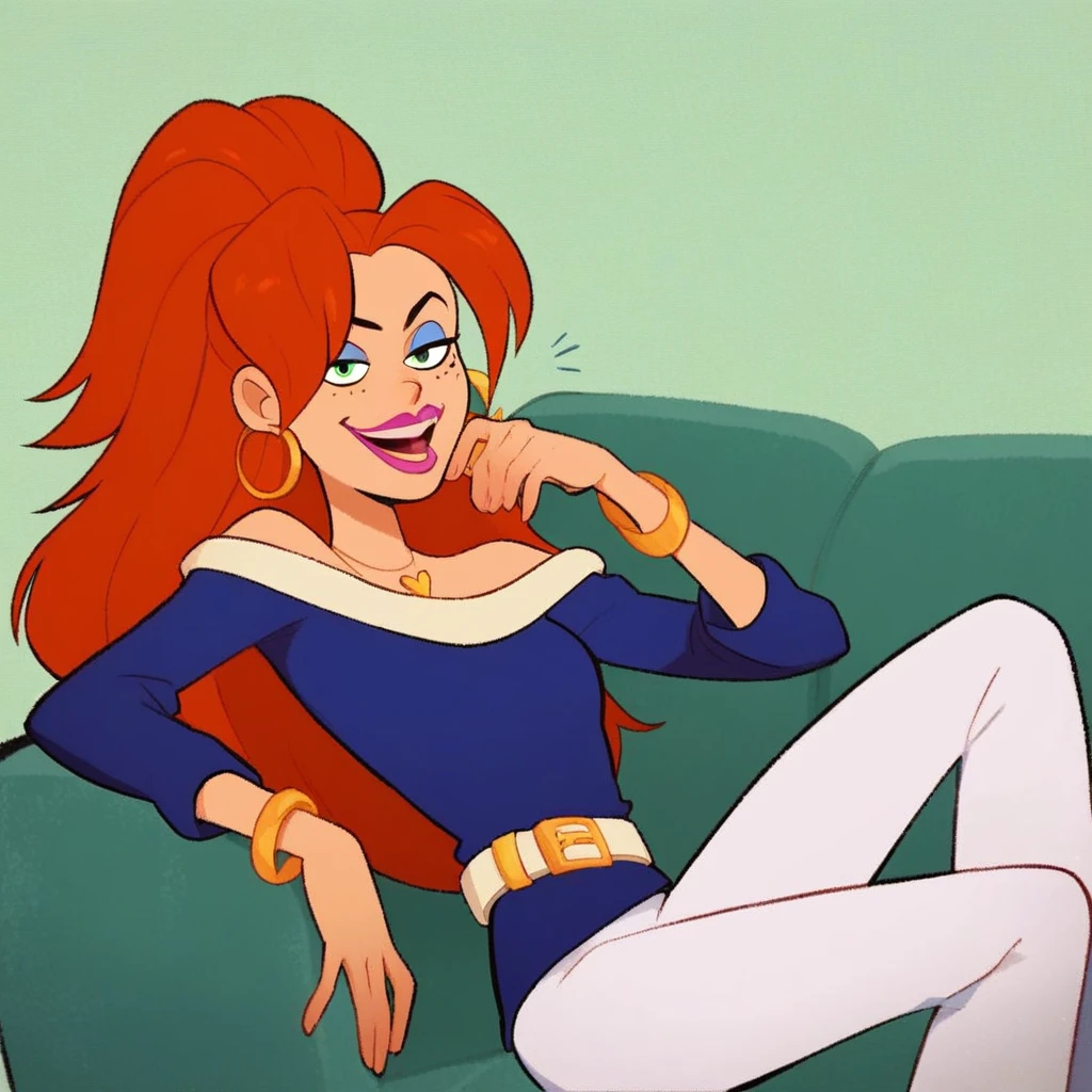 rachel dupain, les sisters, redhead, freckles, green eyes, earrings, pink lipstick, blue headlights