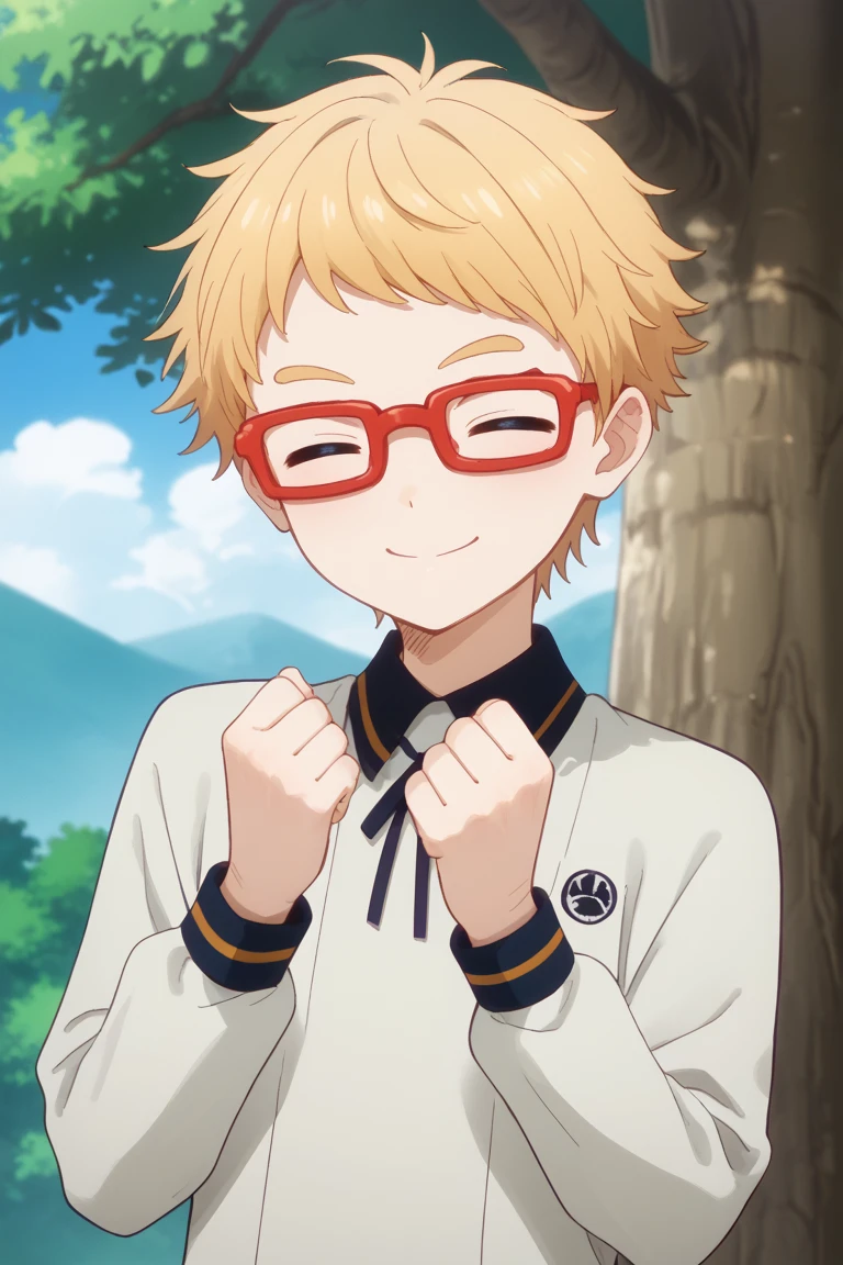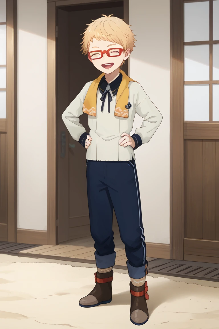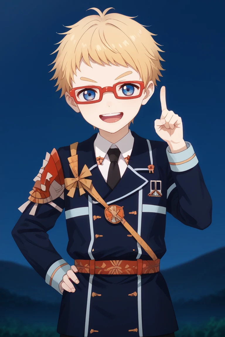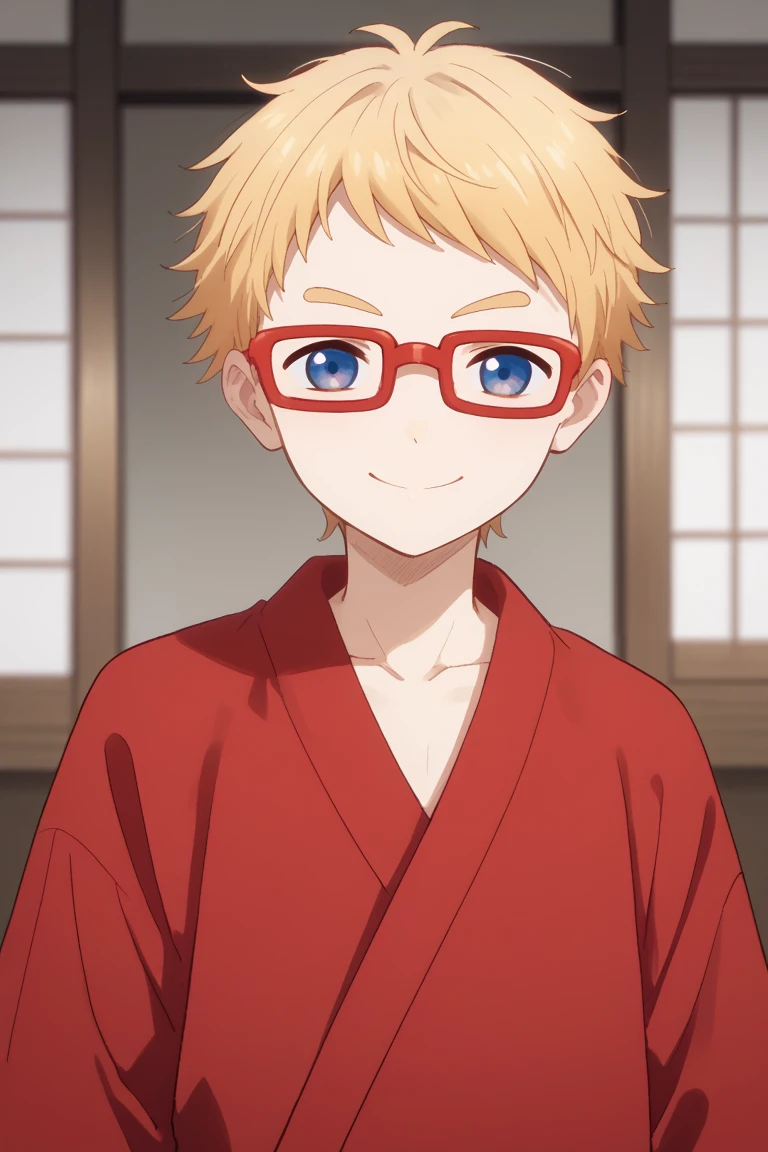 hakata toushirou, blonde hair, blue eyes, red-framed eyewear,