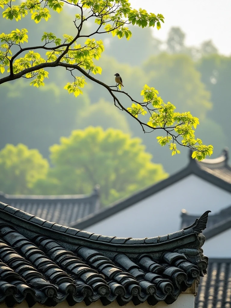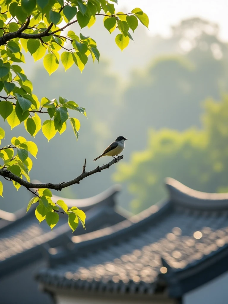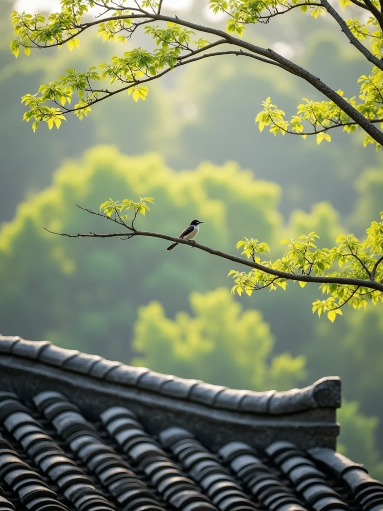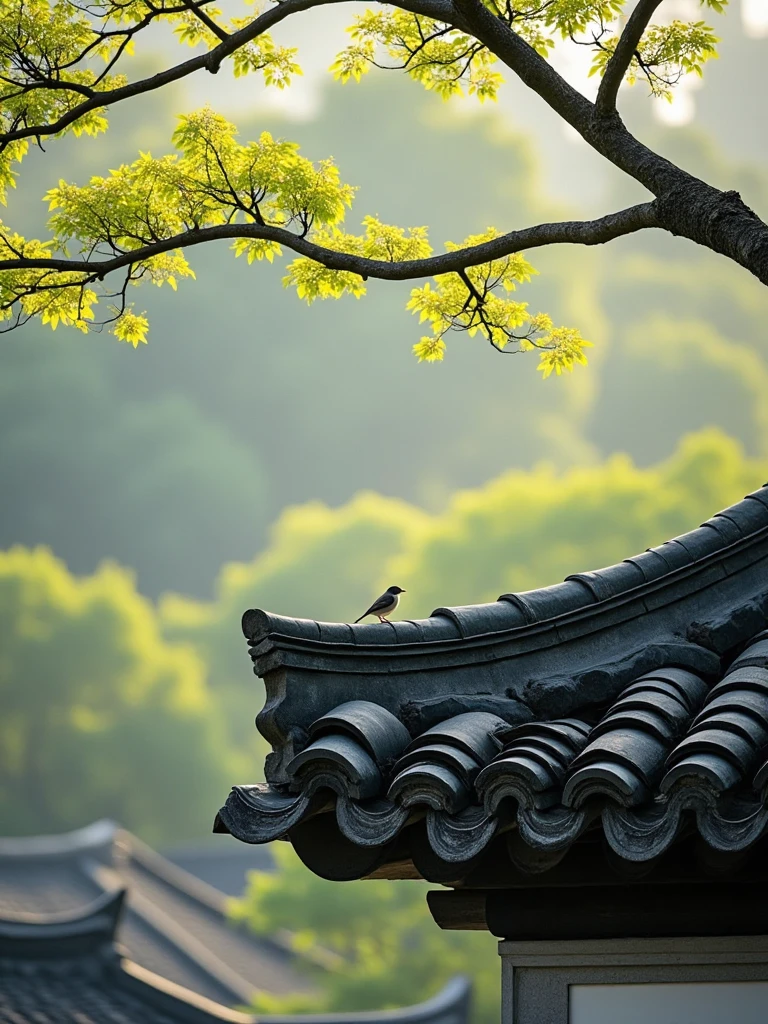 Traditional Chinese architecture with trees and birds, soft morning light filtering through, green leaves shimmering, birds perched on branches, creating a peaceful ancient - style scene.