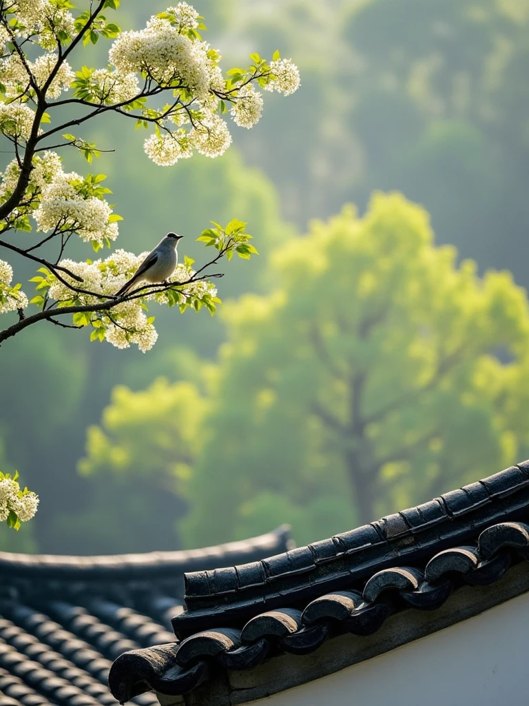 Traditional Chinese architecture with trees and birds, blooming white flowers on trees, birds singing, warm sunlight casting gentle shadows on tiled roofs.