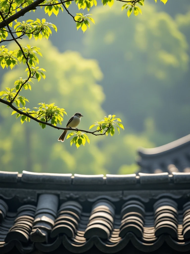 Traditional Chinese architecture with trees and birds, newly sprouted leaves in spring, birds chirping, bringing fresh vitality to the old - style buildings.