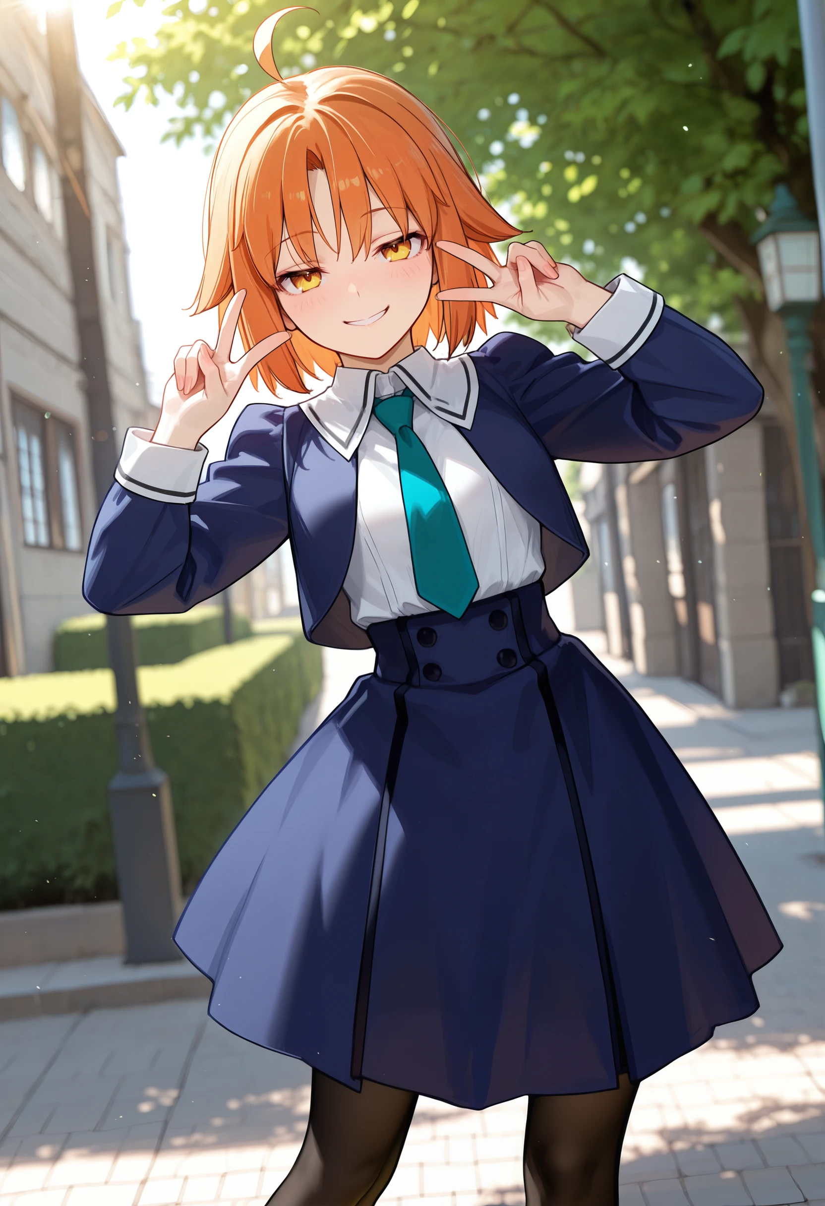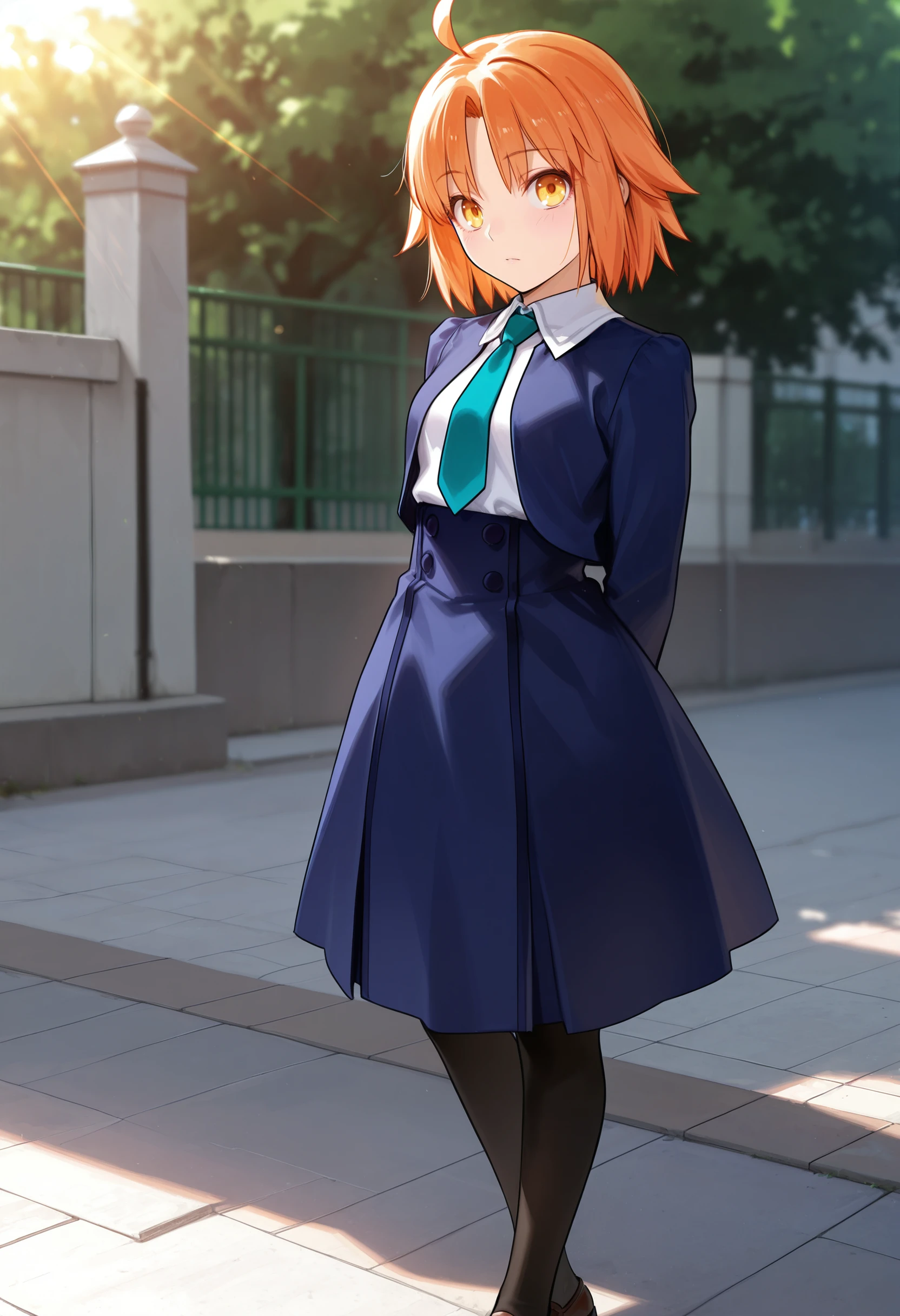 Default outfit: school uniform, pantyhose, necktie, loafers, blue skirt, blue jacket, collared shirt, high-waist skirt,