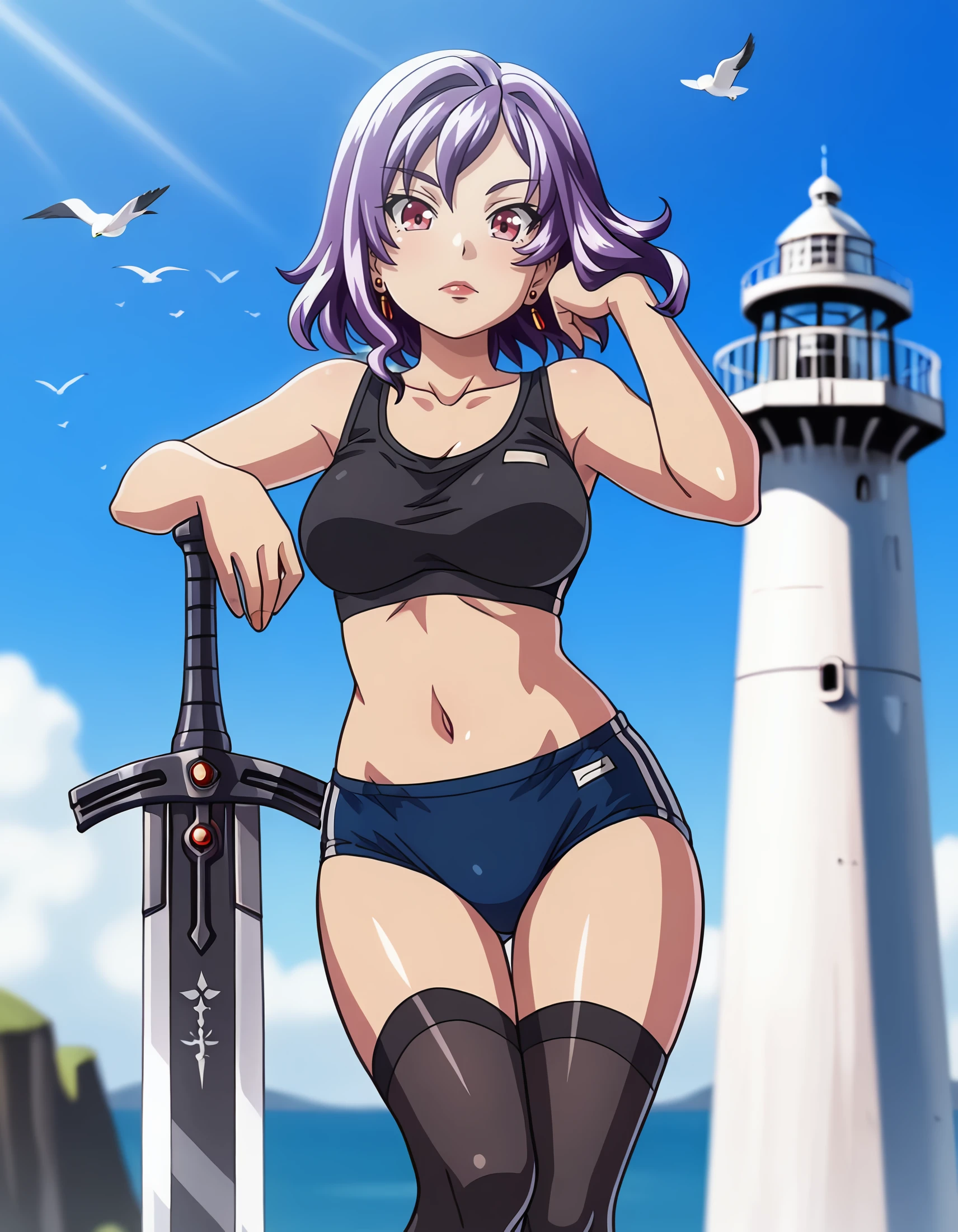 • tsundero_-_ayaka_shiga, short_hair, purple_hair, jewelry, earrings, red_eyes