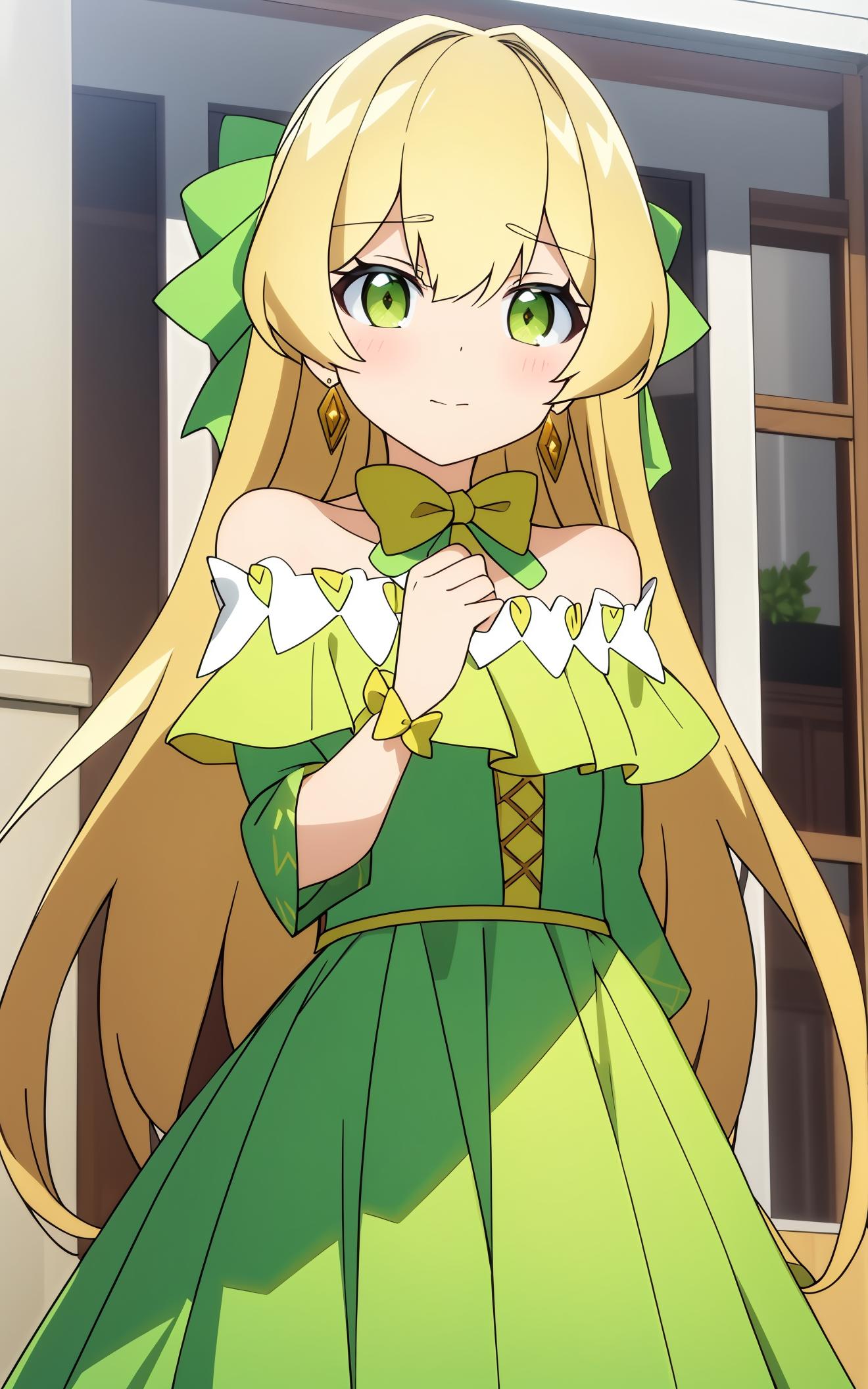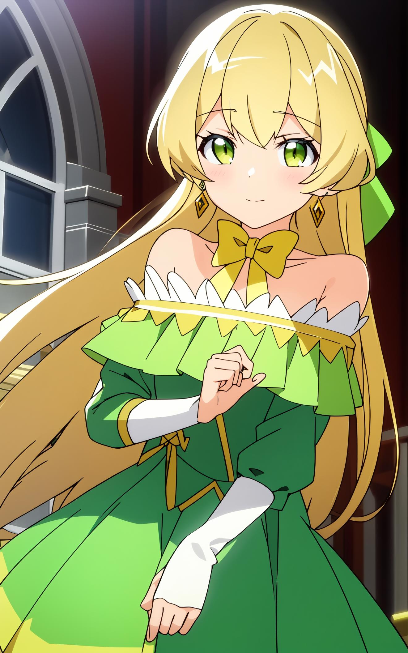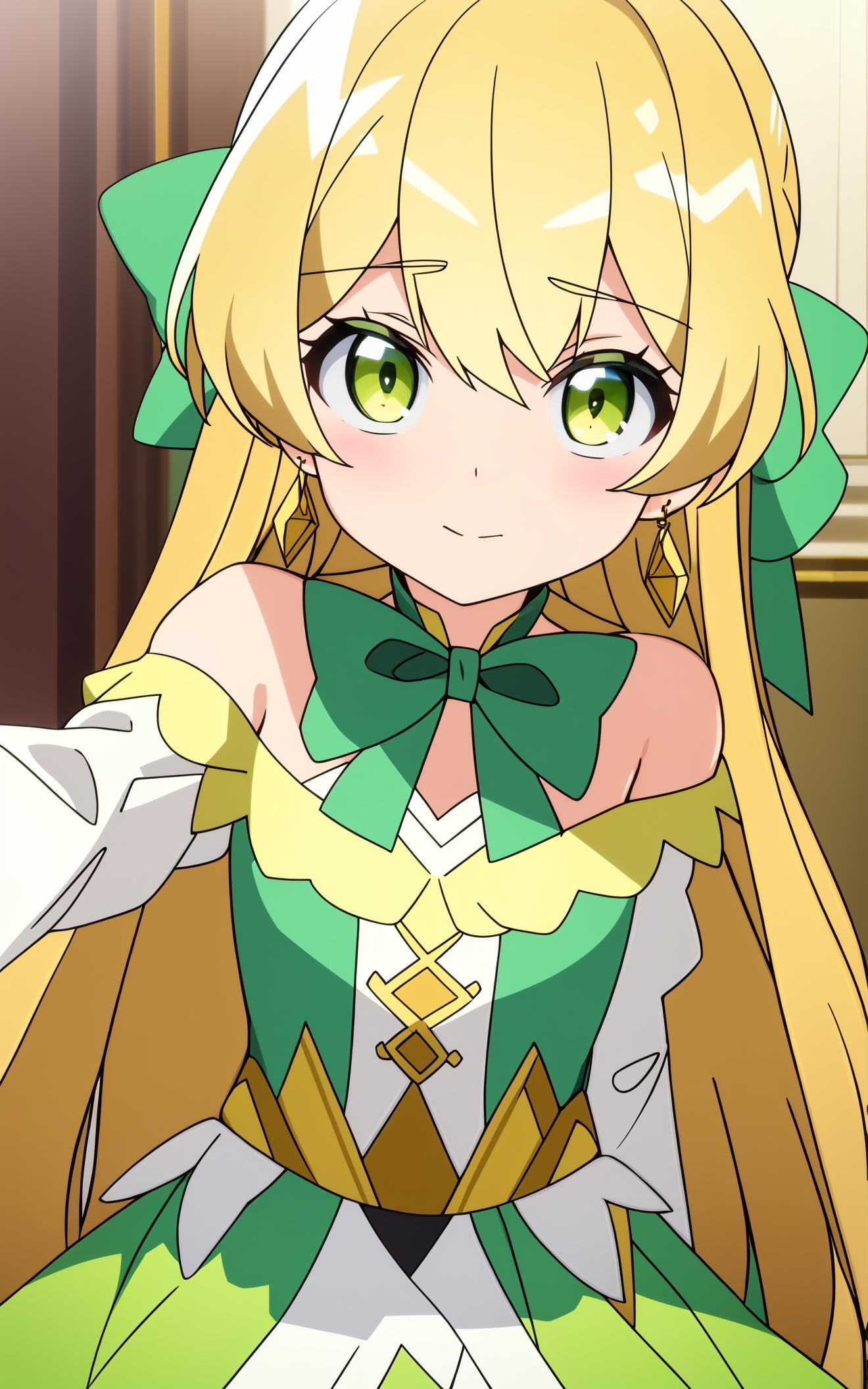 <lora:TelestiaTerraEsfort3:0.85>, teles, (masterpiece), best quality, petite, earrings, jewelry, blonde hair, long hair, green eyes, 1girl, bow, solo, bare shoulders, bangs, yellow bow, green dress