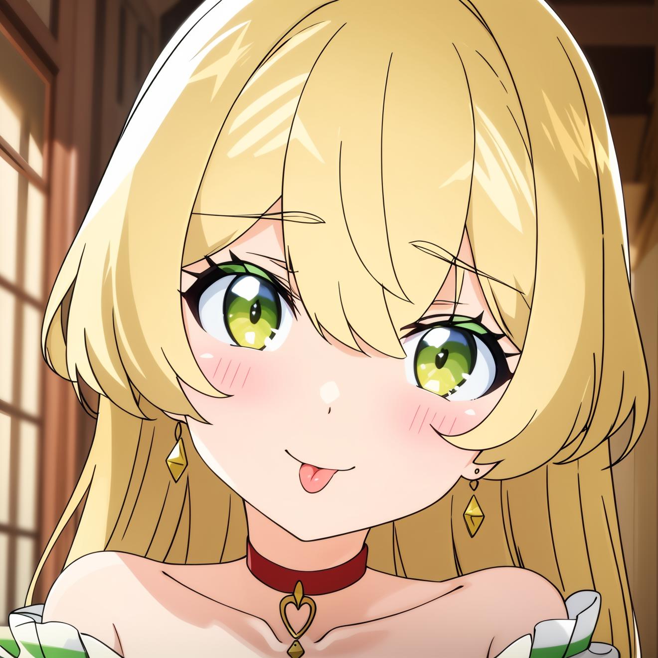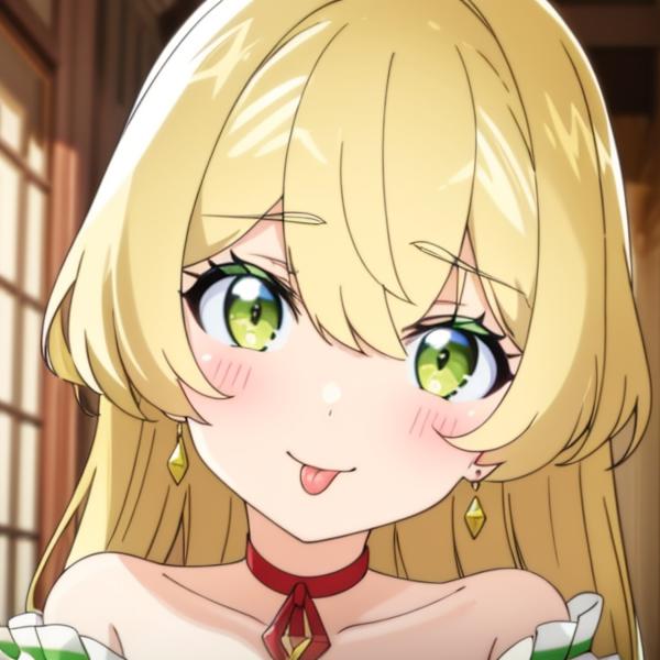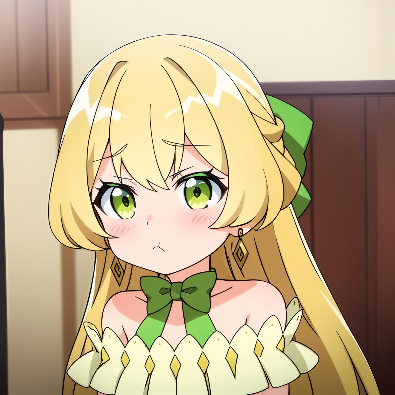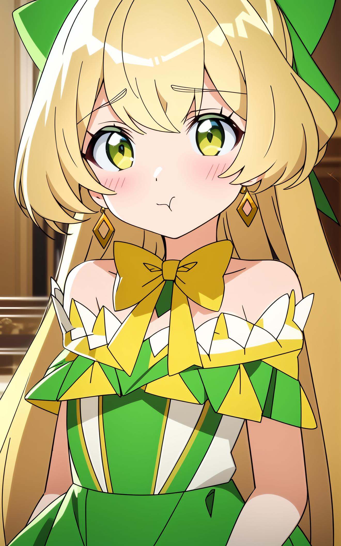<lora:TelestiaTerraEsfort3:0.85>, teles, (masterpiece), best quality, petite, earrings, jewelry, blonde hair, long hair, green eyes, 1girl, bow, solo, bare shoulders, bangs, yellow bow, green dress