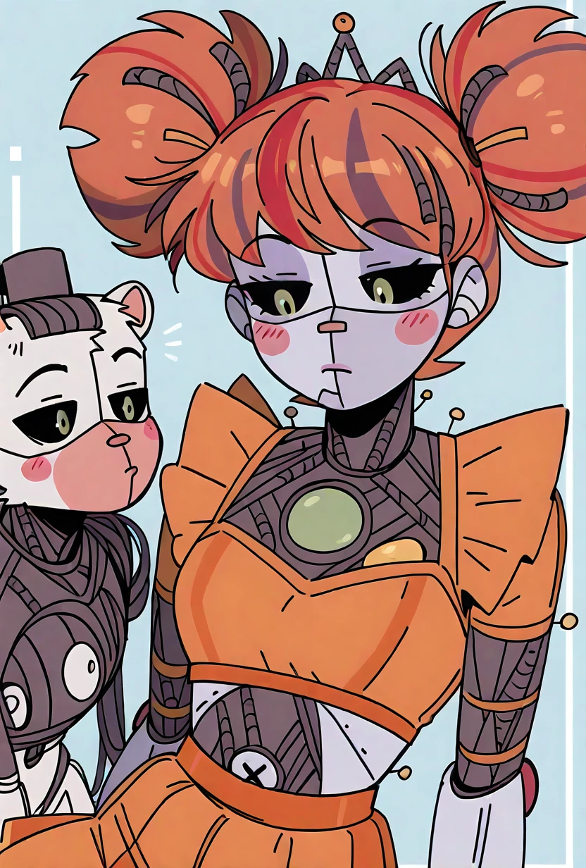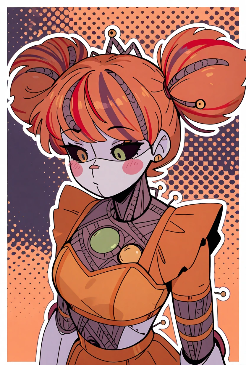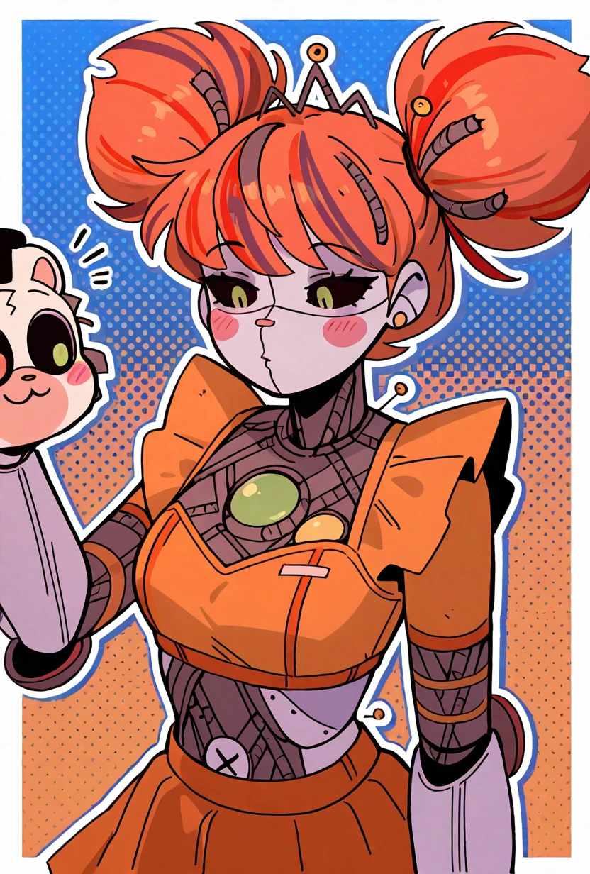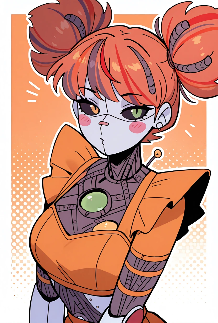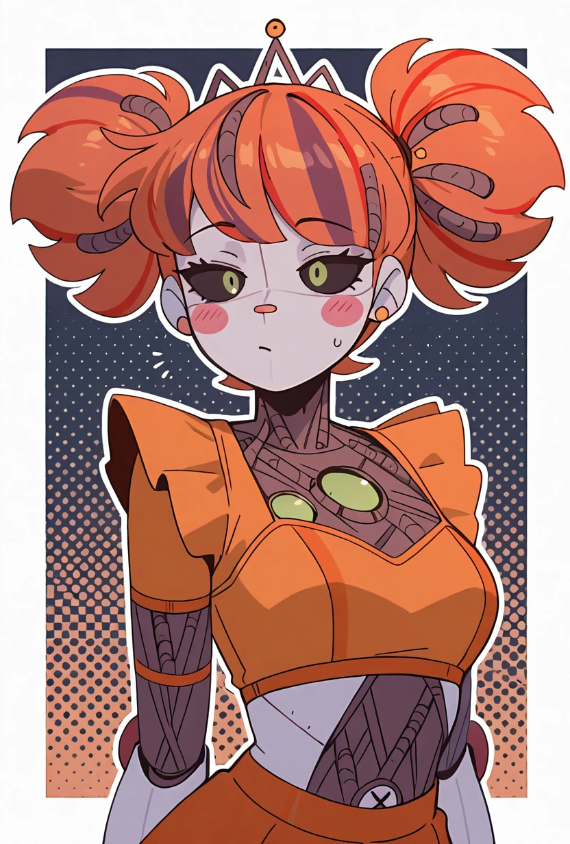 jxitrashbab, 1girl, red hair, multicolored hair, orange hair, robot, blush stickers, streaked hair, android, joints, twintails, colored sclera, double bun, black sclera, colored skin, orange crop top, orange skirt,