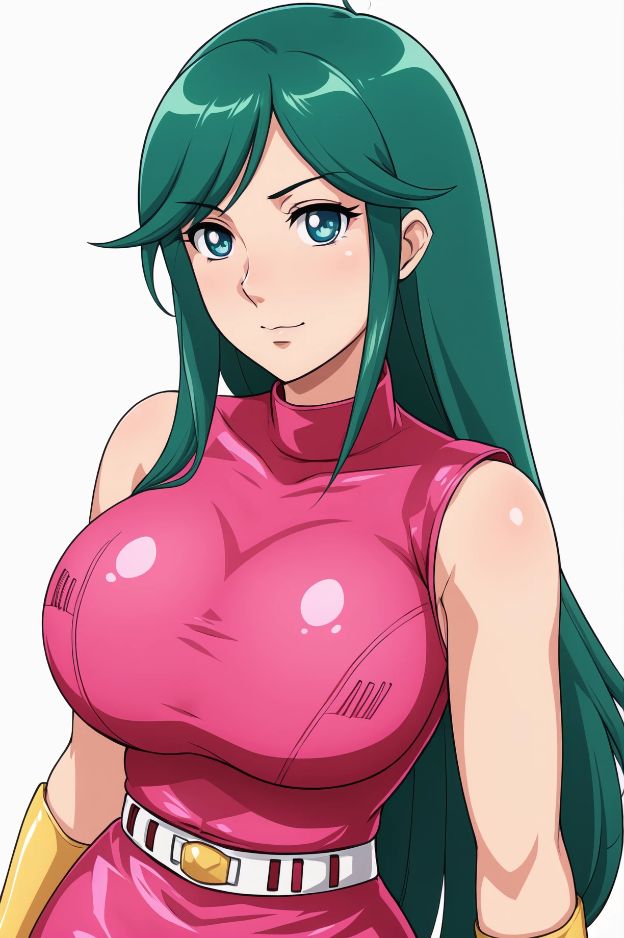 pink dress, miniskirt, belt, gloves, turtleneck, pink sleeveless,