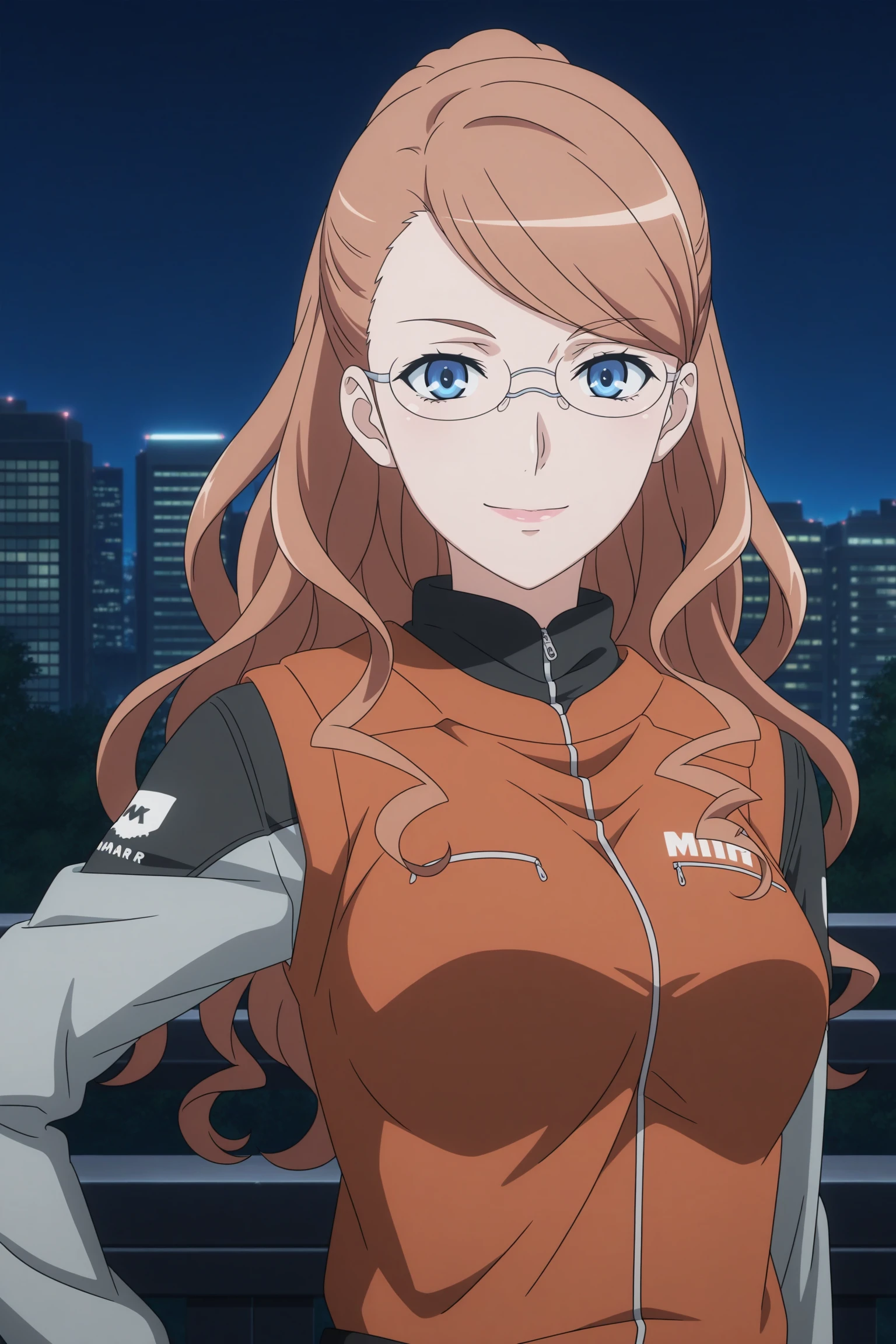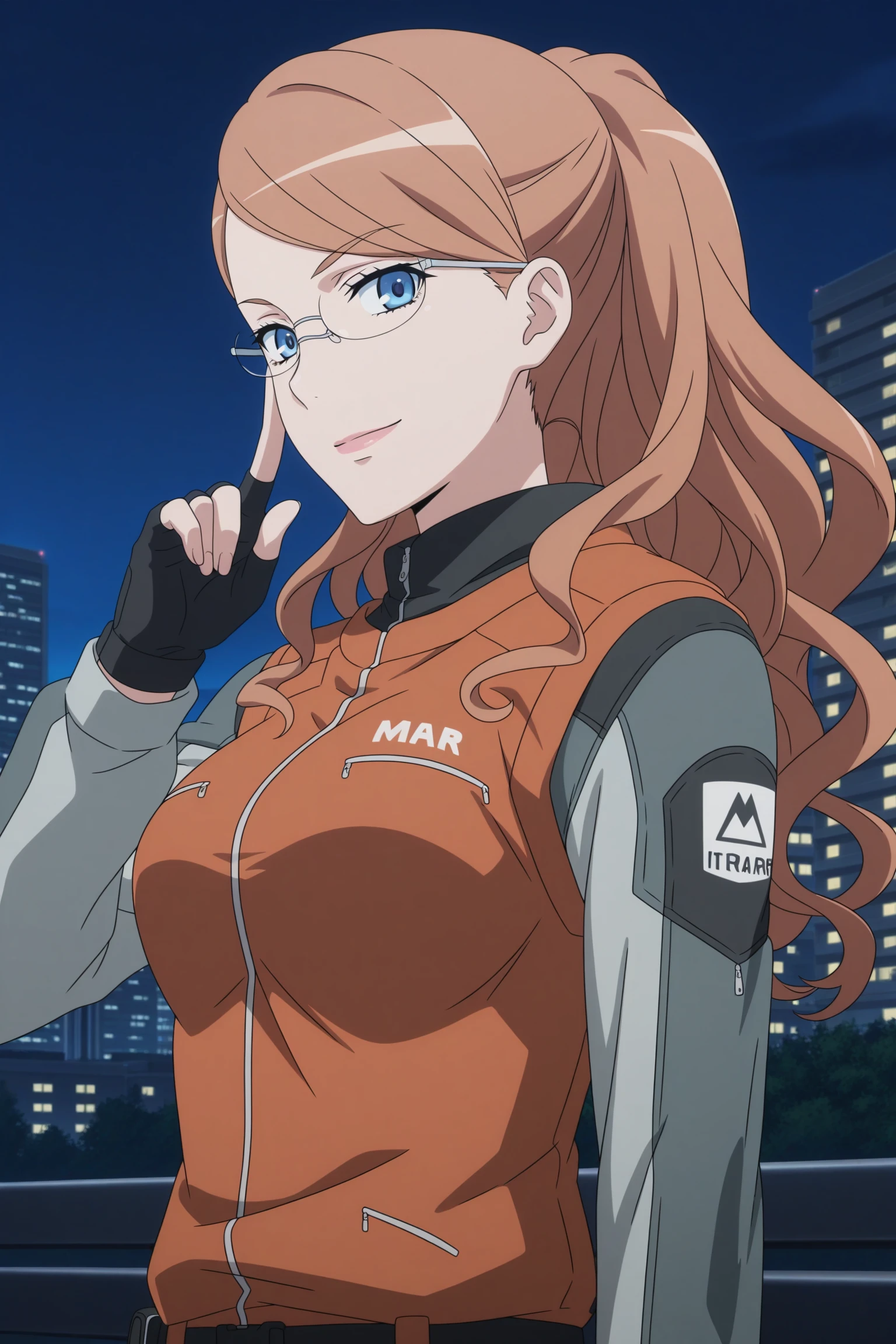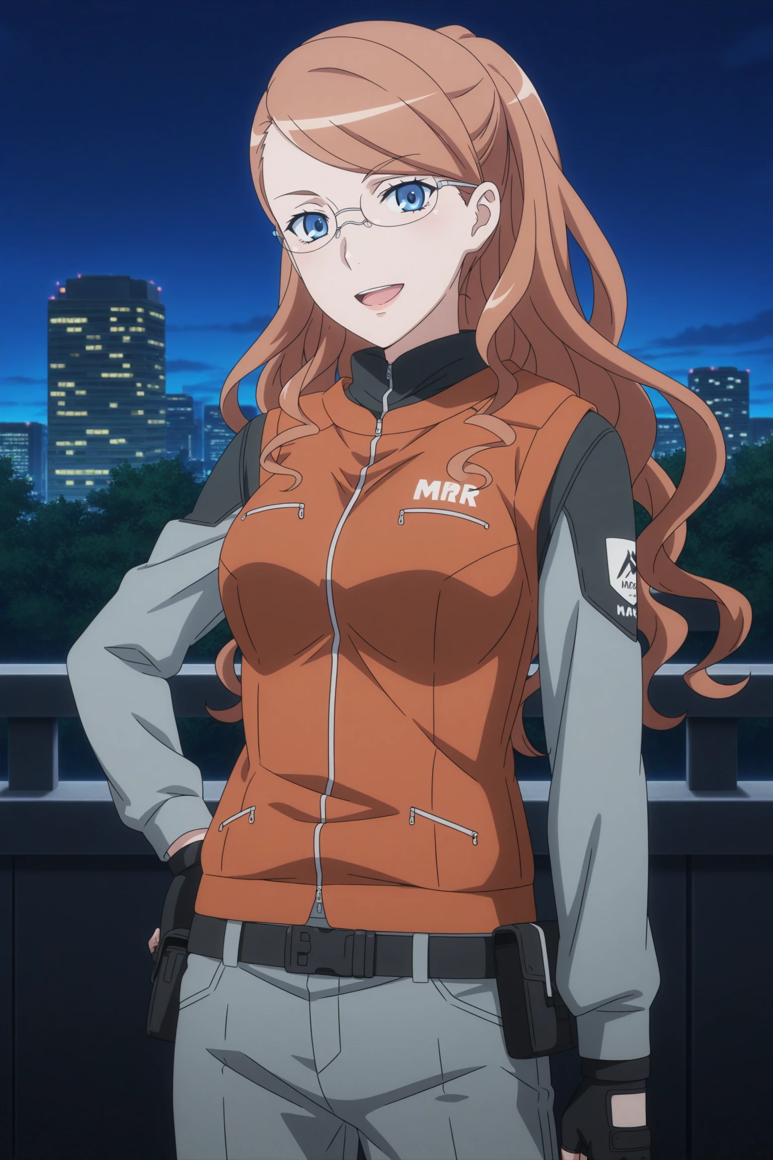 therestina kihara lifeline, brown hair, long hair, ponytail, wavy hair, blue eyes, glasses, long sleeves, grey jacket, orange vest, black gloves, fingerless gloves, black belt, grey pants