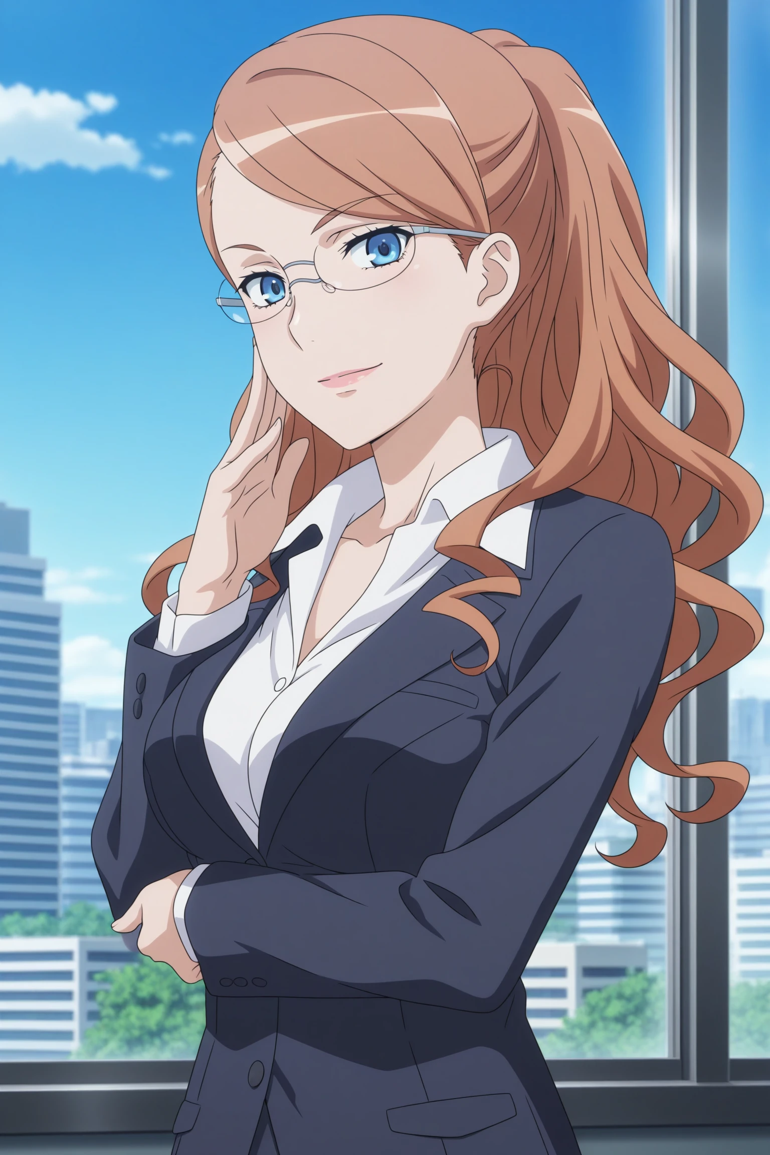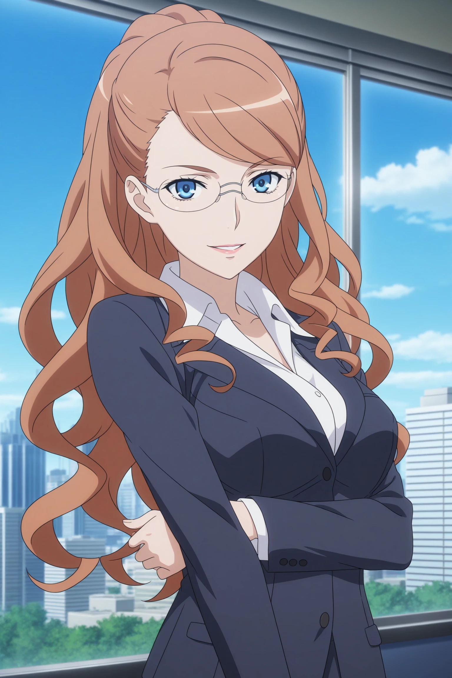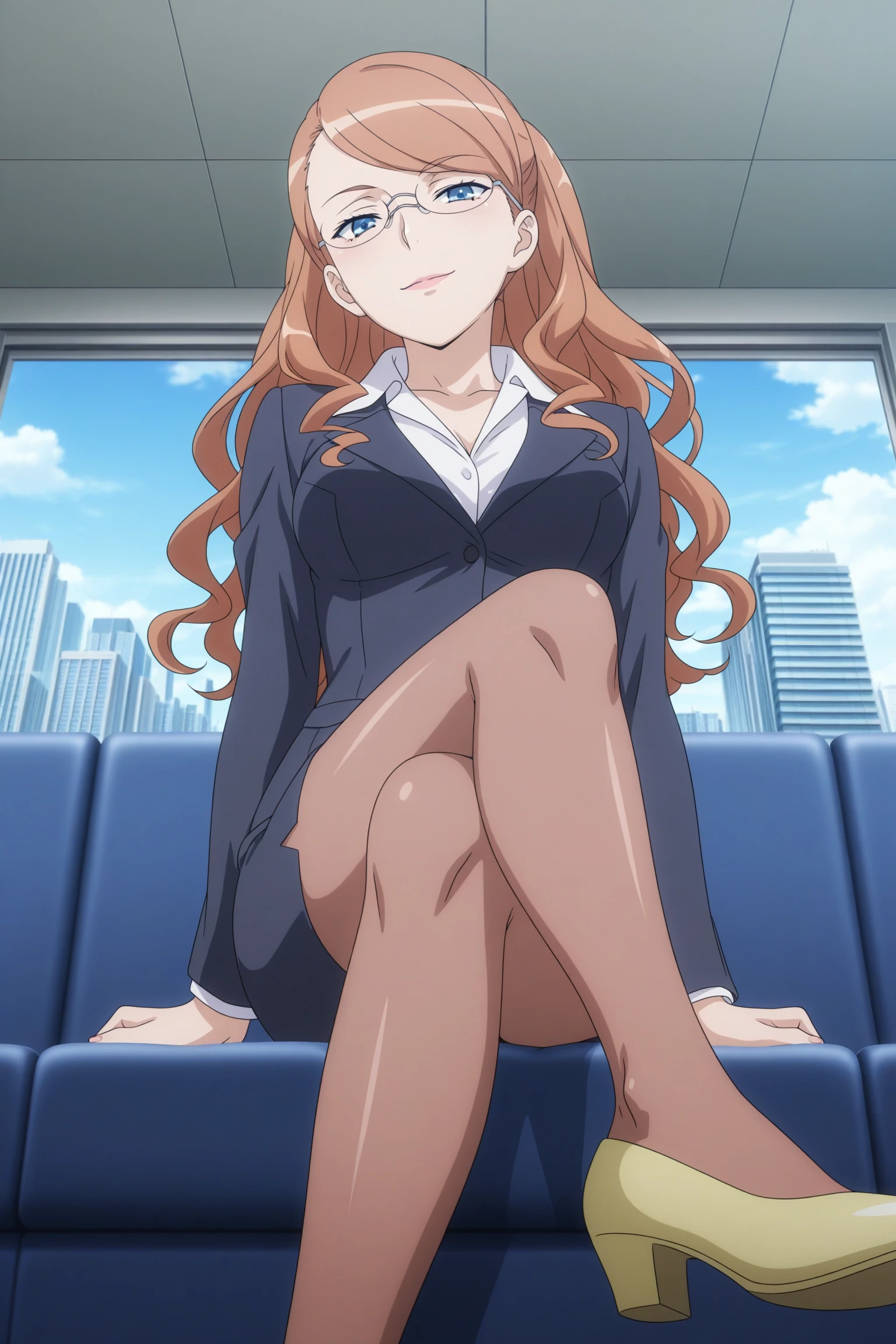 therestina kihara lifeline, brown hair, long hair, ponytail, wavy hair, blue eyes, glasses, suit, white shirt, collared shirt, black jacket, black skirt, pencil skirt, brown pantyhose, yellow footwear, high heels