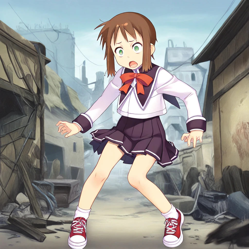 Earth Outfit: school uniform, sailor collar, neck bow, sleeve cuffs, pleated skirt, ankle socks, white socks, sneakers, red footwear