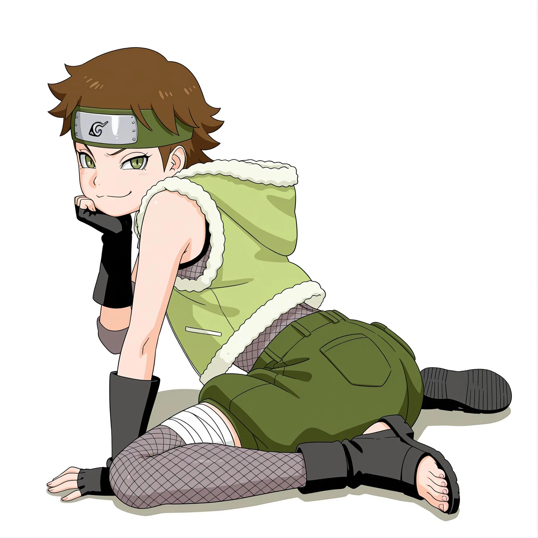wasabi1, wasabi2, fingerless gloves, forehead protector, green sleeveless jacket, green sleeveless jacket with fur trim, brown hair, short hair, hood, fur trim hood, olive green shorts, fishnet innerwear, fishnet inner suit, olive green eyes, cat eyes, long open toe shoe,