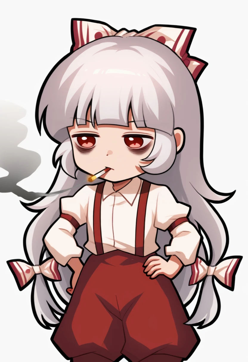 I've noticed that, because of the training data, some of Fujiwara no Mokou's wardrobe may "merge" (not sure what the correct word is to use here.) with other characters. If that's the case, you can put tags such as: red ribbon, hair ribbon, patterned ribbon, suspenders in the negatives. You can also put text in the negatives (Since most, if not all) of the training data had text in them.