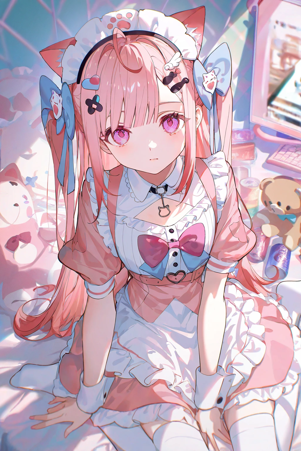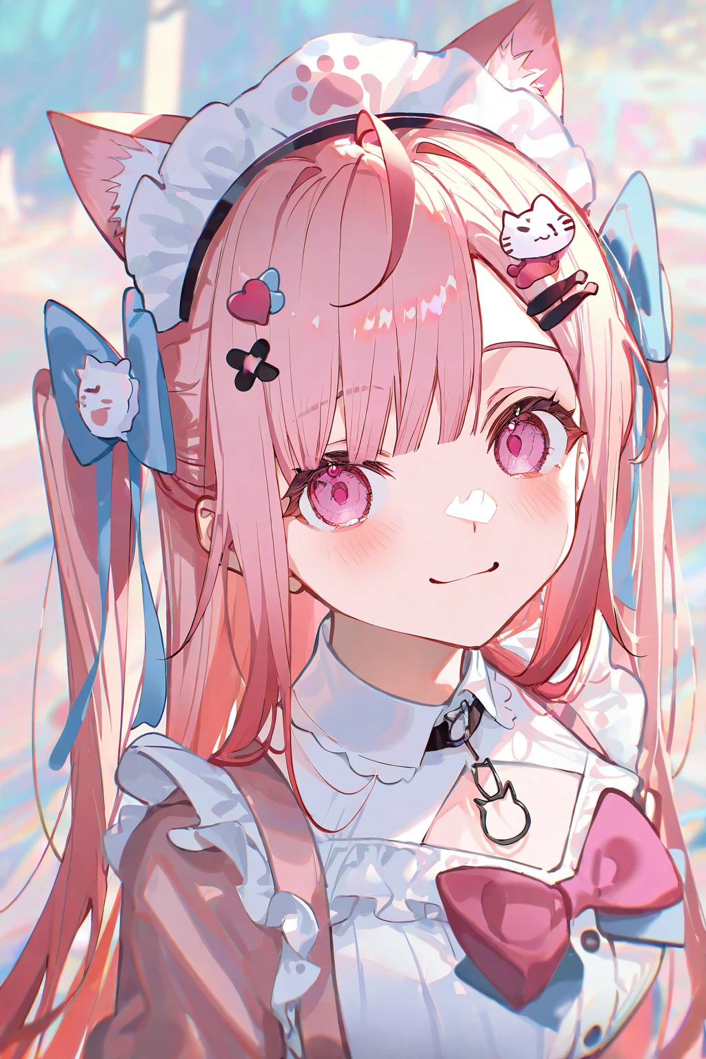 1girl,yuuki sakuna, animal ears, pink hair, cat ears, maid headdress,hair ornament, bow, animal ear fluff, ahoge, bangs, two side up, cat hair ornament, hair bow, hairclip, blue bow, pink eyes,默认服装